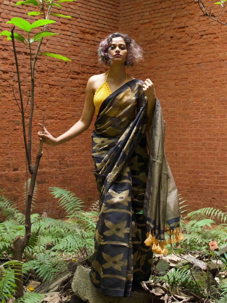 This saree is made of a gorgeous fabric that is a blend of cotton and polyester, hand-woven on a Jacquard handloom. Here, a set of punch-cards are attached to handlooms to sort the weaving patterns. This makes it easier and faster for weavers to weave the fabric to life. The saree is fluid, soft, falls amazingly well and embodies the charms of handloom fabrics.