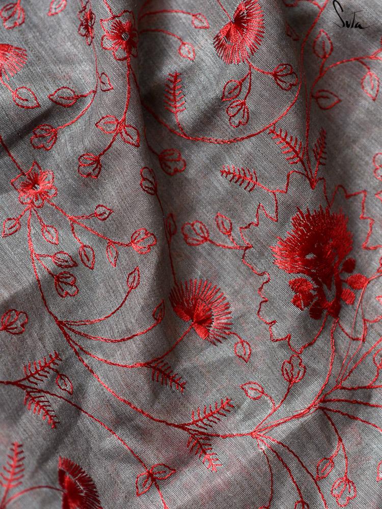 This is a grey coloured saree in poly nylon that comes alive with the delicate machine-embroidered floral designs!