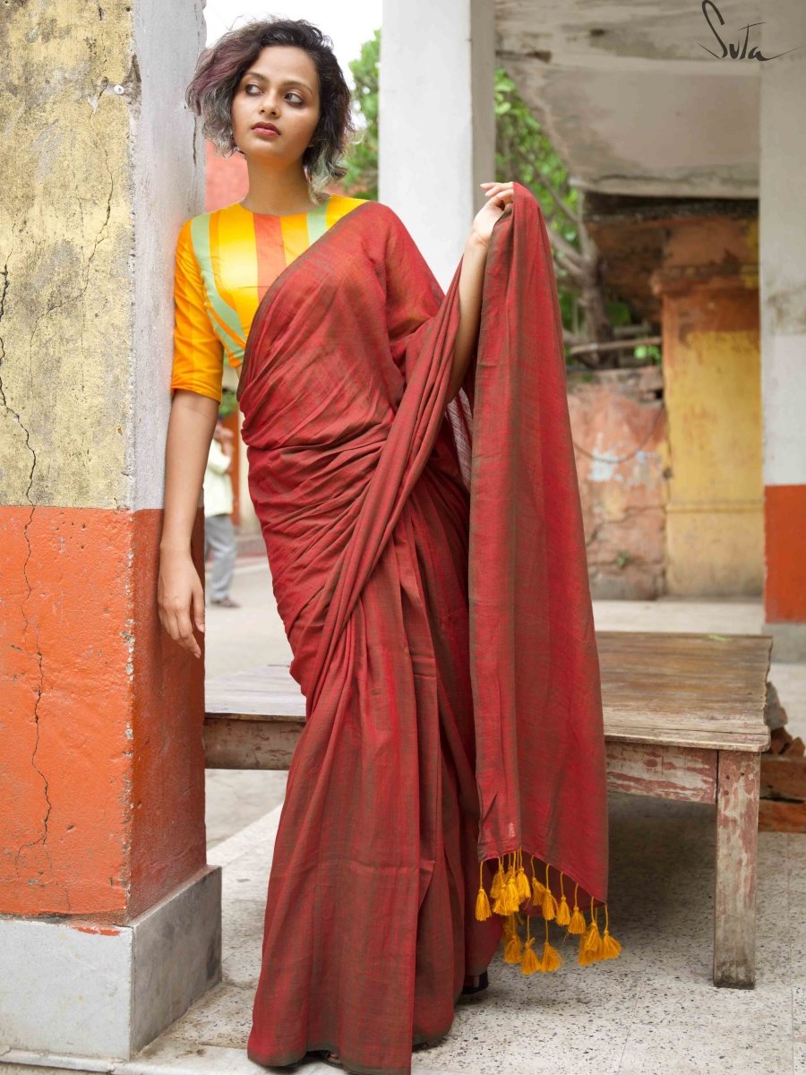 This maroon and yellow mul viscose saree is amazing!