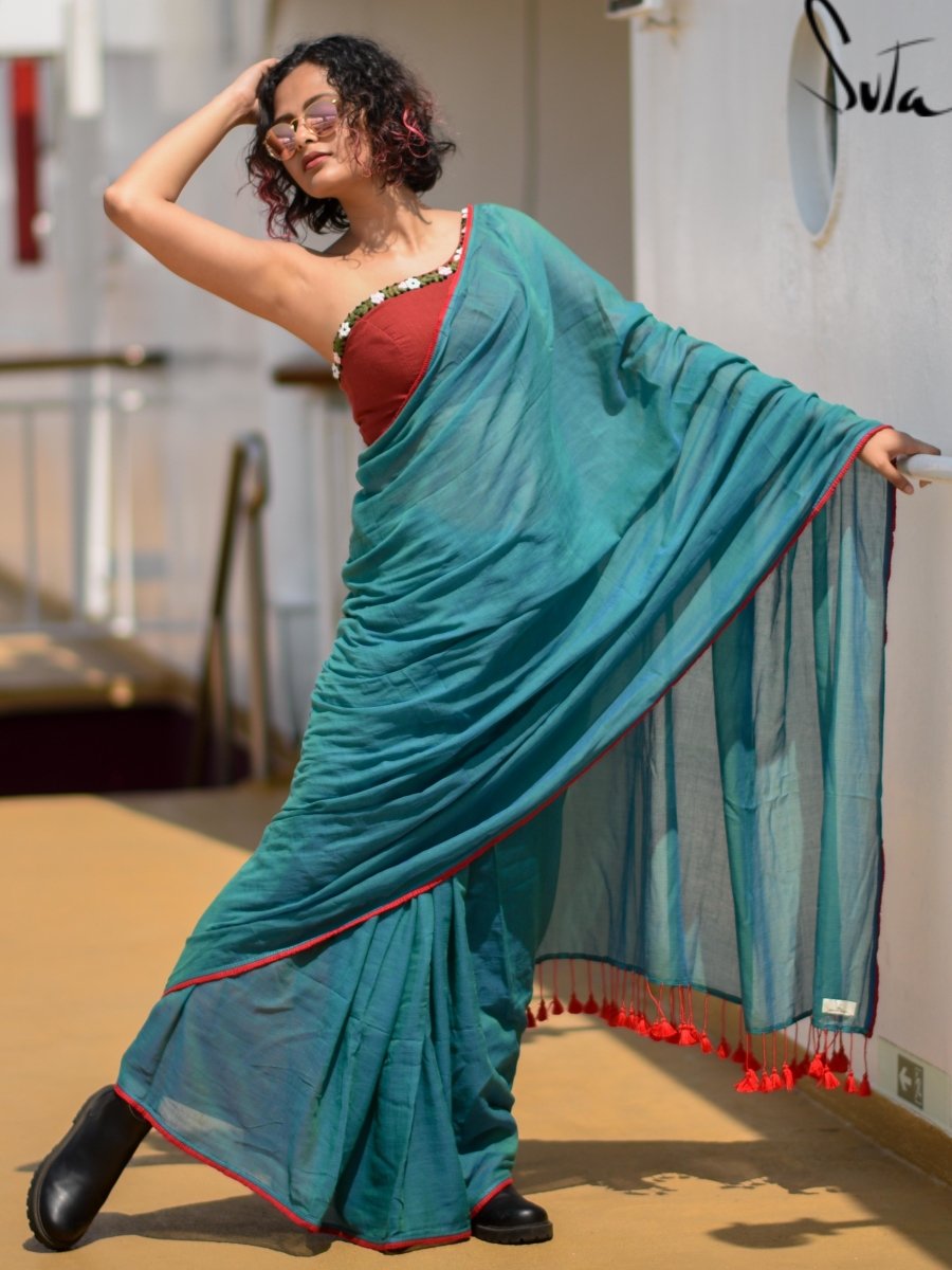 Ruffles are the perfect addition to the incredibly soft and light made-in-heaven Mul fabric. The small pleats are skilfully done and is a time consuming process. These pretty ruffle sarees are an amazing addition to your wardrobe because they offer the perfect mix of elegance and spunk.