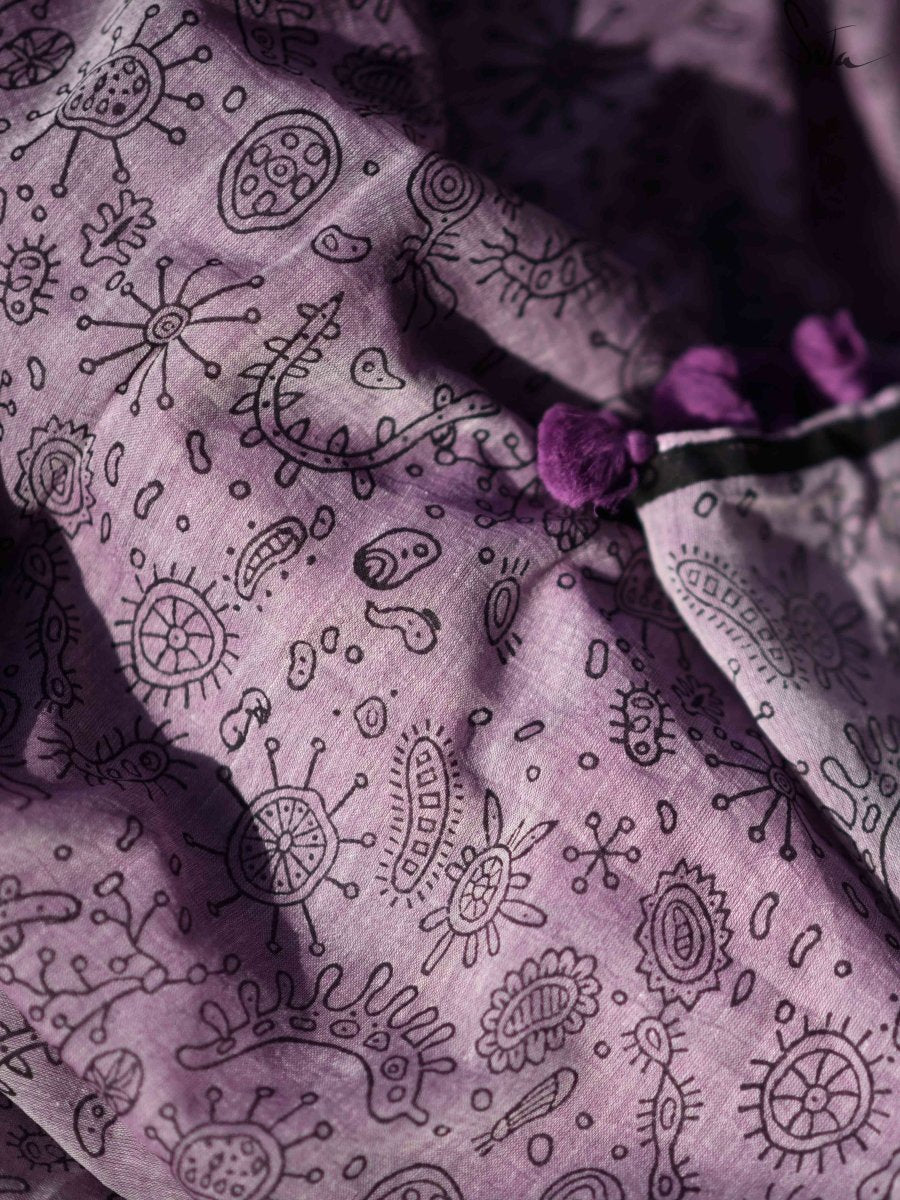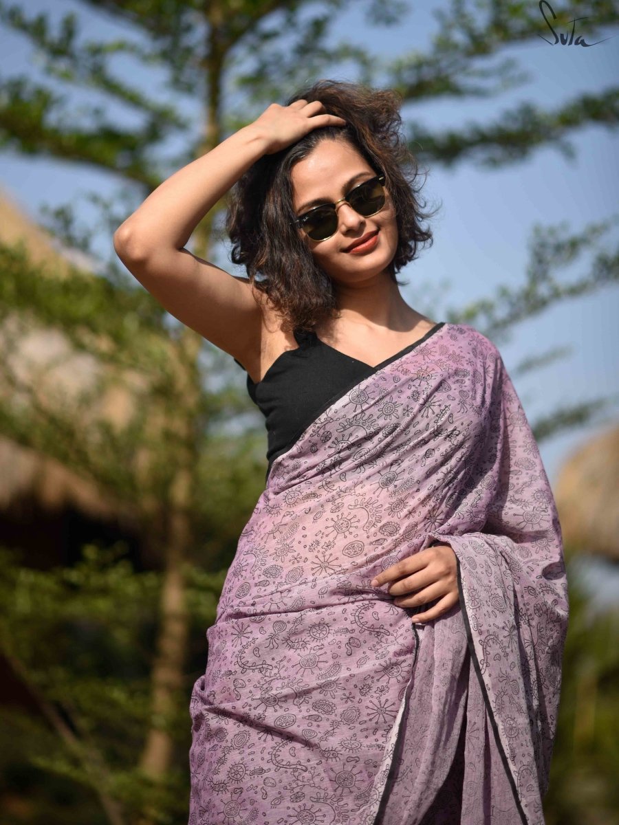 My mind says this is going too fast. My heart says it is too slow.My lips want to say the words to you. My biology, my instinct, says we are already one. This beautiful lavender saree with quirky hand block printed designs related to biology will make you fall in love at first sight! The made-in-heaven mul fabric makes it a delight to drape.