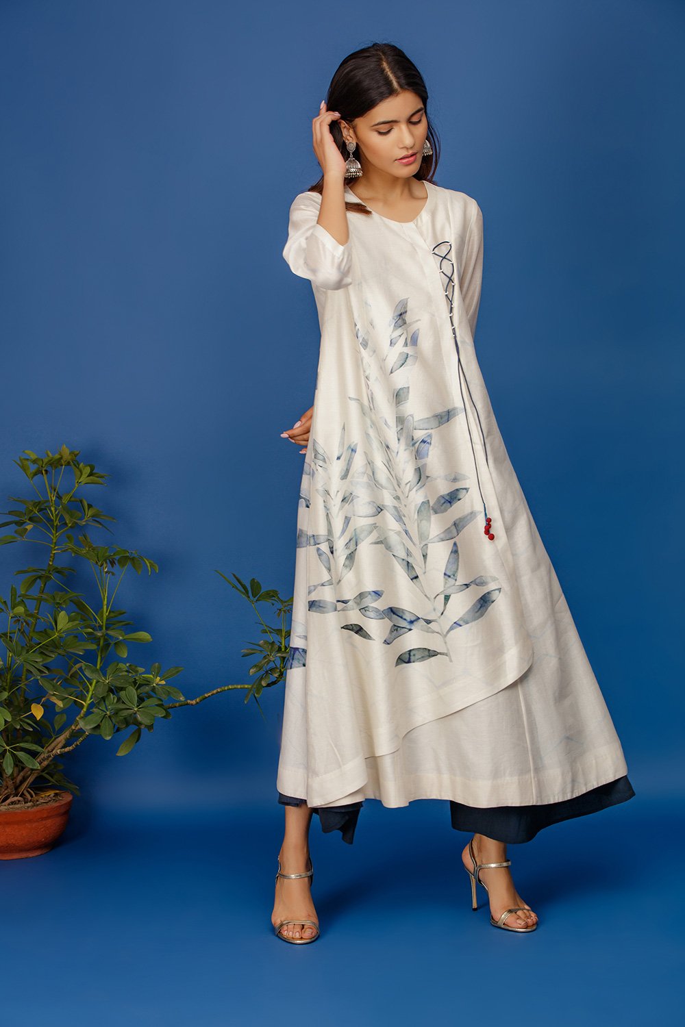 Cyanotype Print Leaf Motif Full Length Beautiful Angrakha Kurta With Asymmetrical Hemline & An Eye Catching Criss-cross Dori.
