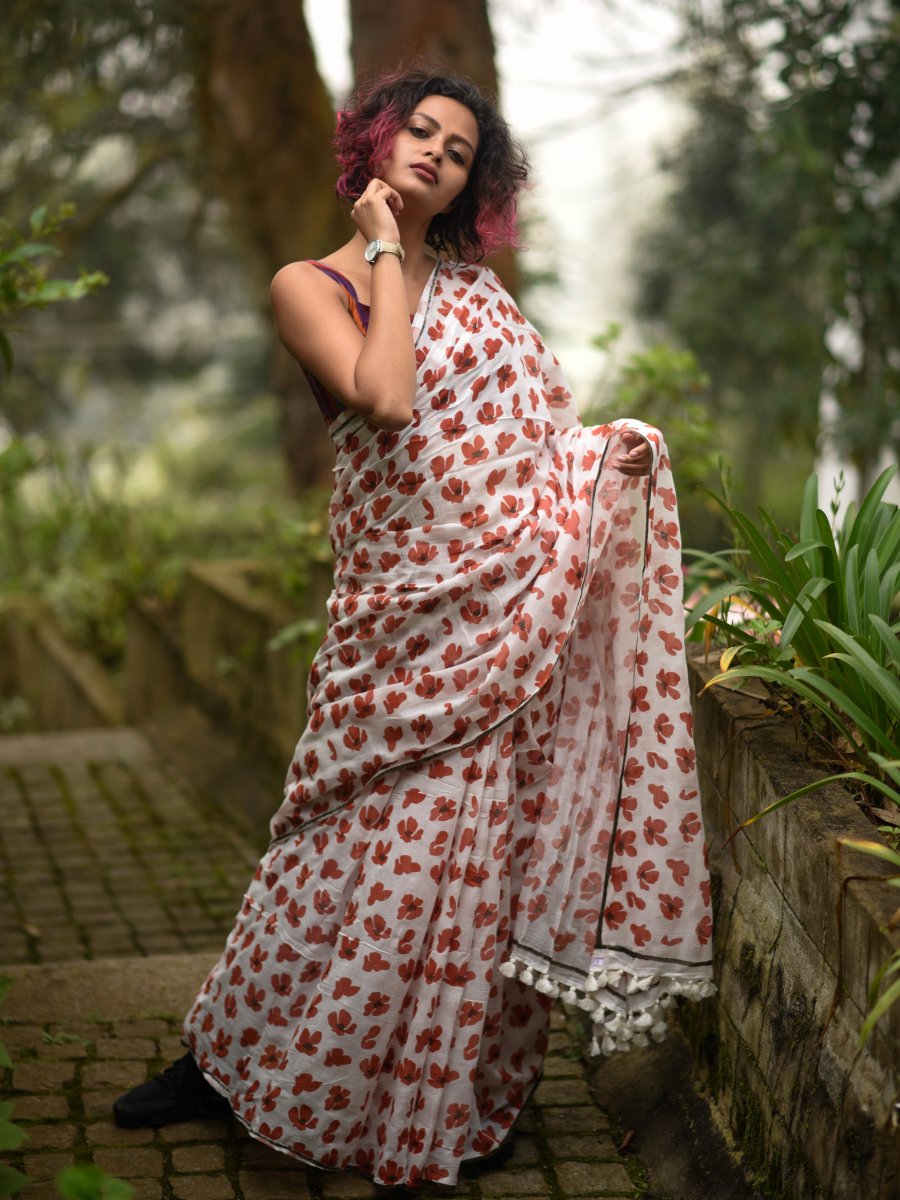 This saree with red and white hues is a made-in-heaven mul cotton with block-printed design.