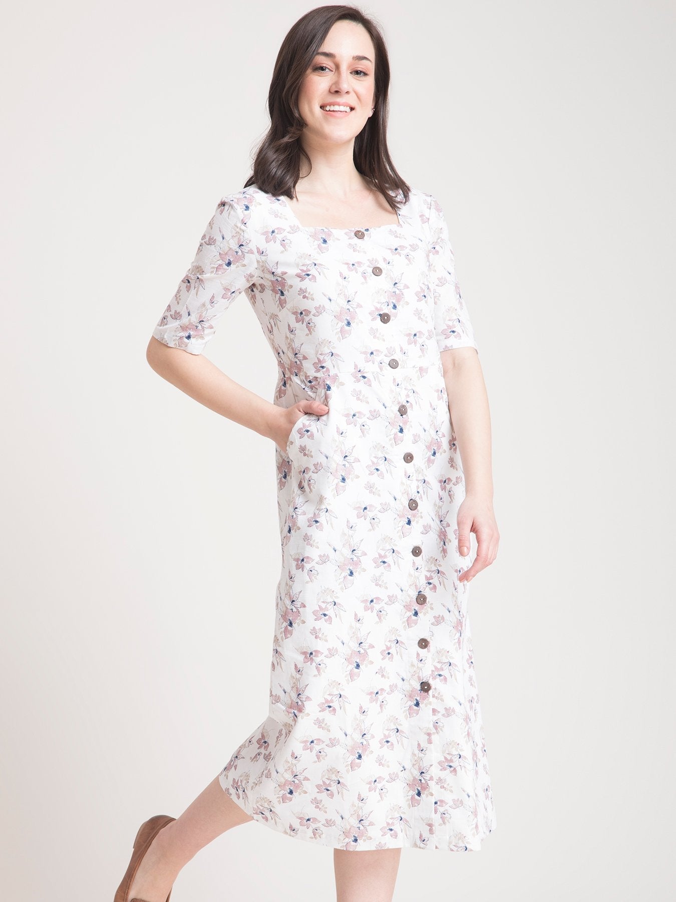 This pink and white fit and flare dress, fit and flare, button down dress has a square neck, floral print, short sleeves, placket with wooden buttons, pockets and Cotton blend lining. Made from Cotton Linen, it is breathable and comfortable.