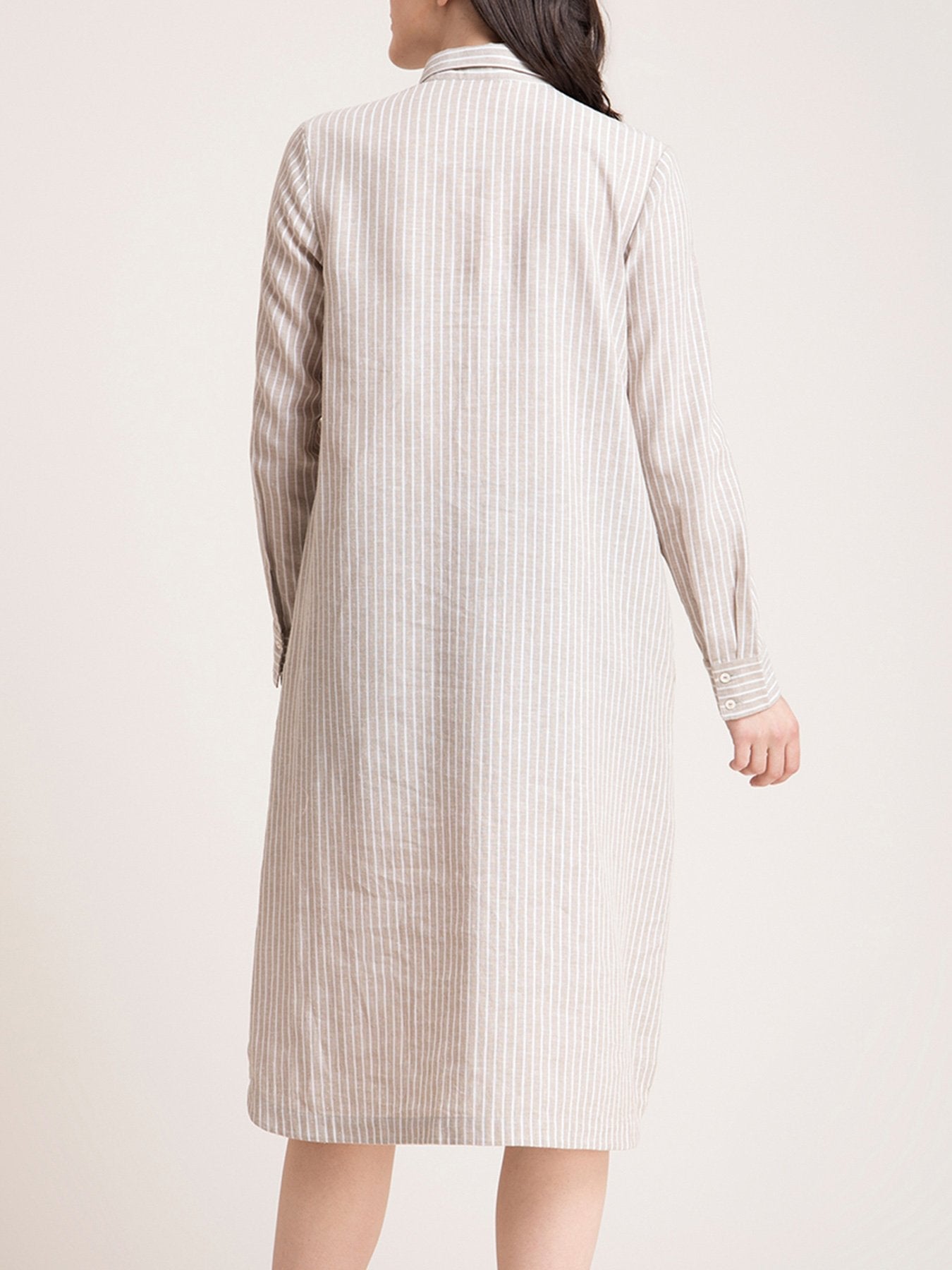 This beige and white shirt dress has a regular collar, stripes, button down placket with double shell buttons, contrast thread stitch on the button, full sleeves, belt, pockets and side slits with curved slit detail. Made from Cotton Linen yarn dyed, it is breathable and comfortable.
