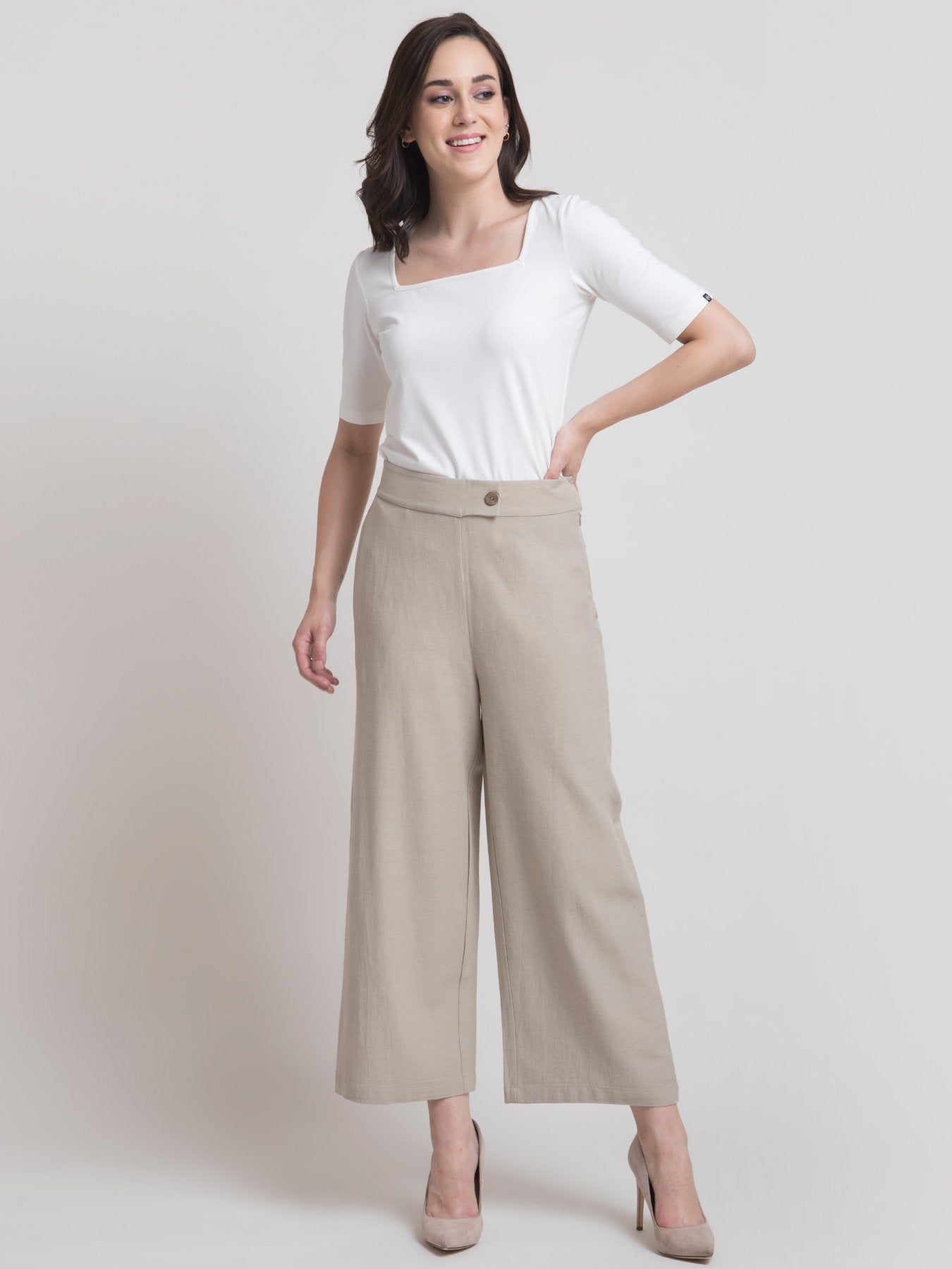 These beige, mid-rise culottes have elastic on the back, faux wooden button, pocket and zip & hook for closure. Made from Cotton Flex, these are breathable, comfortable and have a textured surface.
