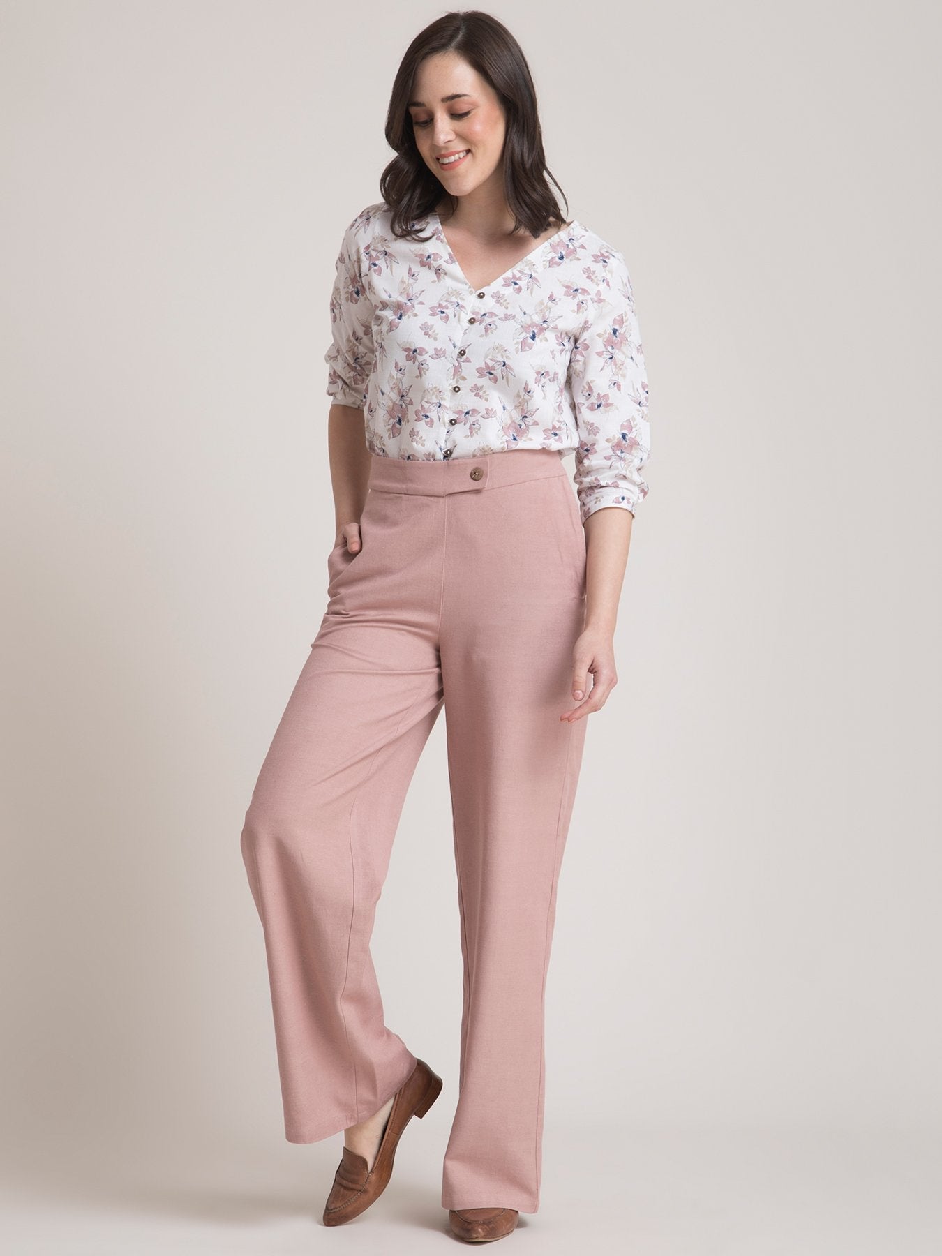These dusty pink, wide leg, mid-rise pants have faux wooden button, pocket and zip & hook for closure. Made from Cotton Flex, these are breathable and comfortable.