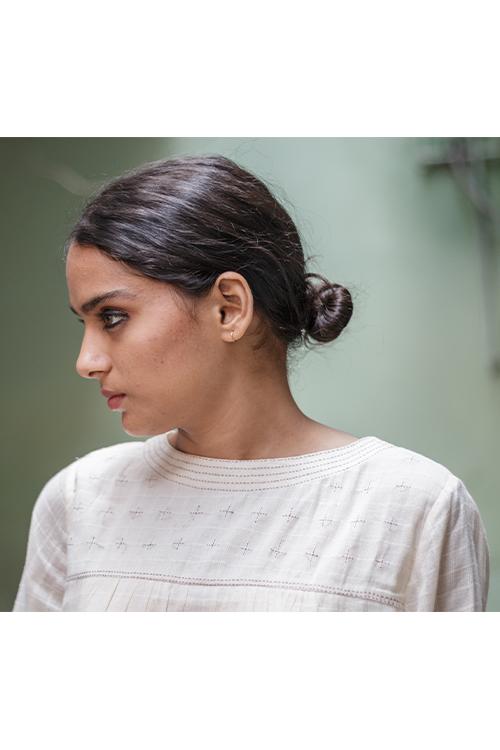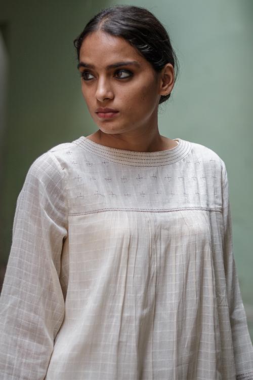 A sheer styling baloon short kurta is a blend of style & comfort. Pretty plain kurta with high boat neck with little tanka work. Casual wear with uniqueness of BAYAAR designs.Can be worn as dress too.