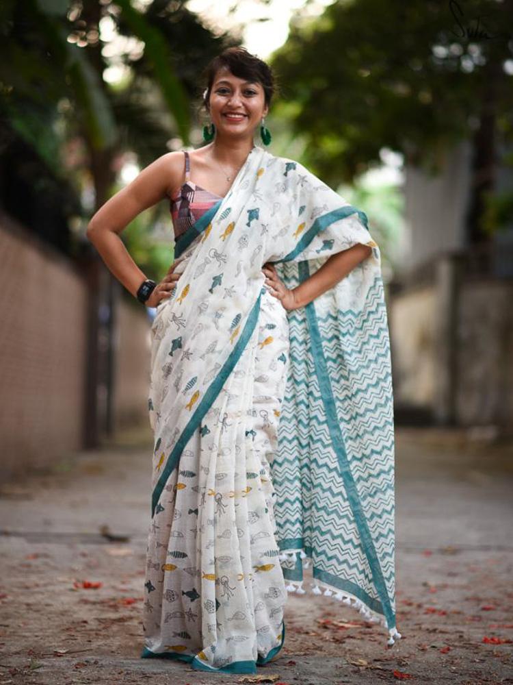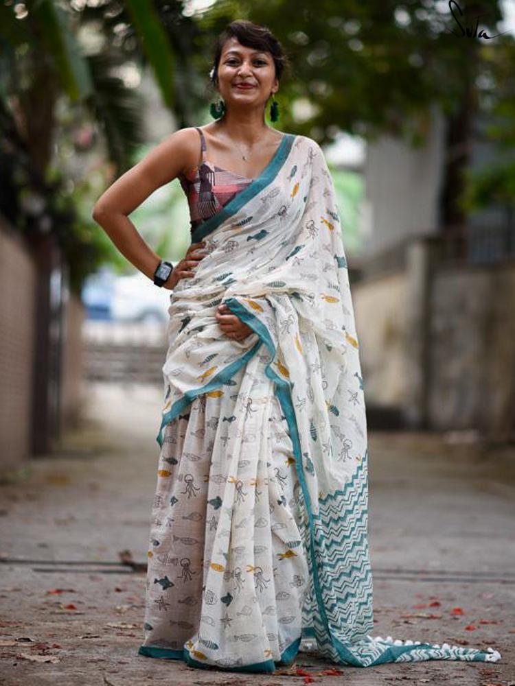 This charming mul cotton saree is hand block printed with absolutely cute fish motifs that seem to be swimming around in delight!