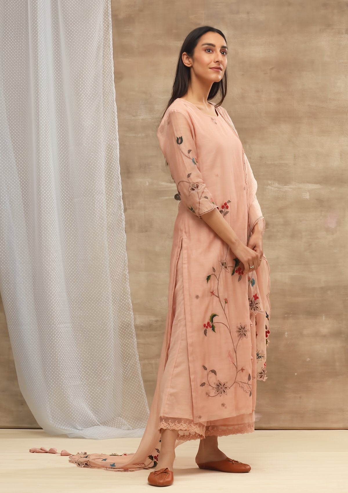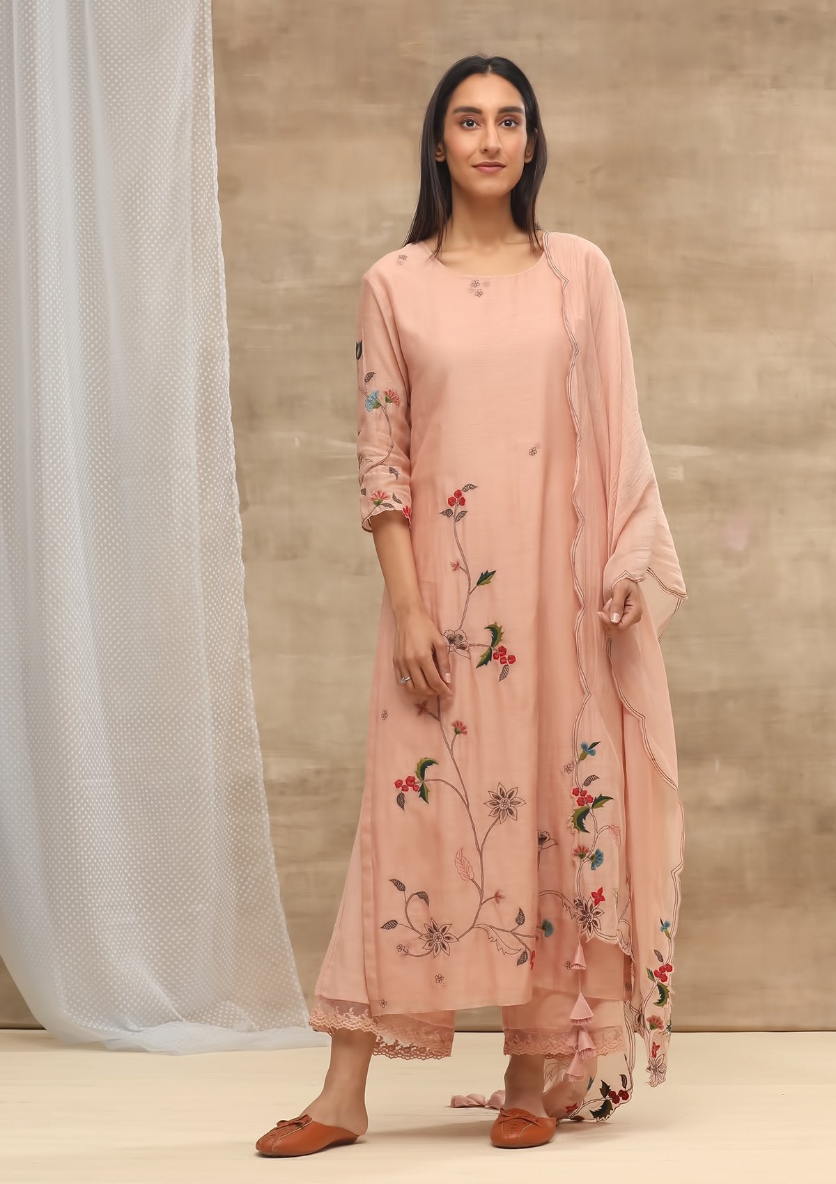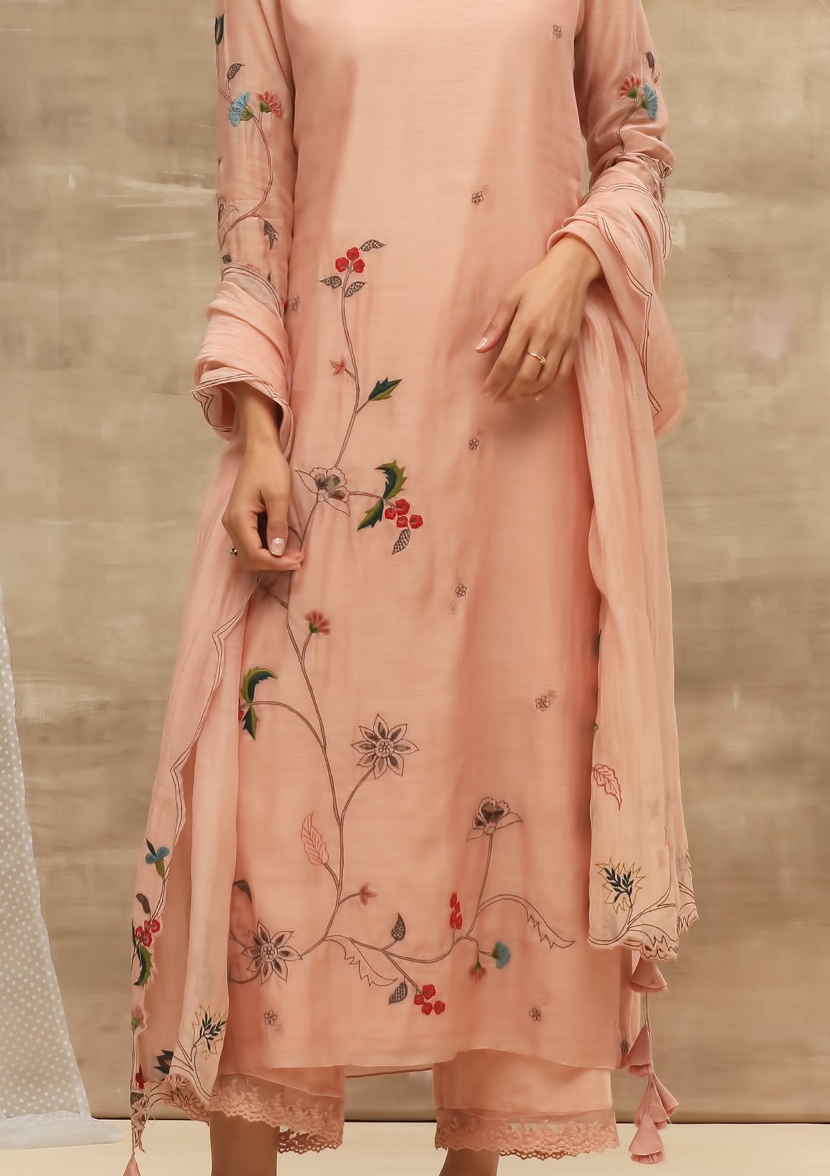 A blush pink cotton Chanderi kurta with applique embroidery. Its comes with an applique embroidered dupatta.