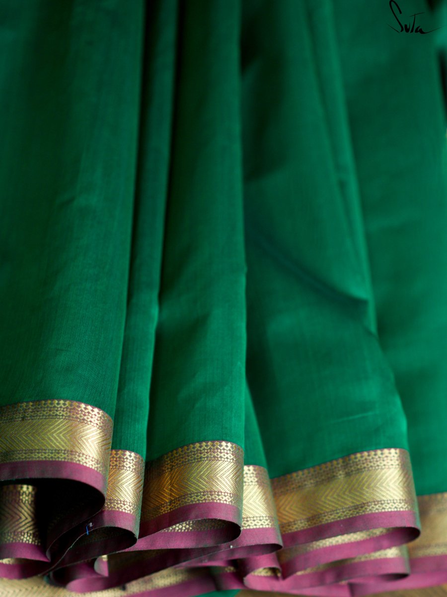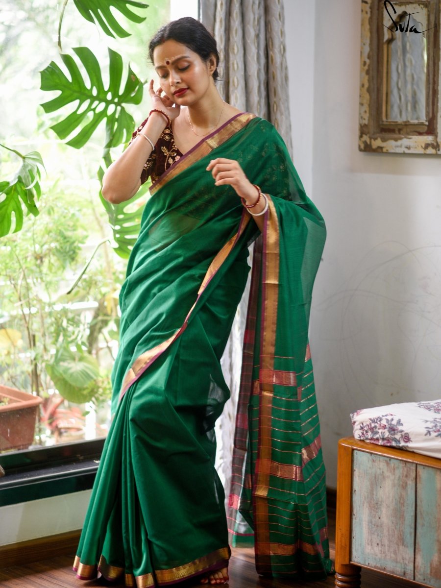 This green saree in handloom silk cotton with zari border is what saree dreams are made of!