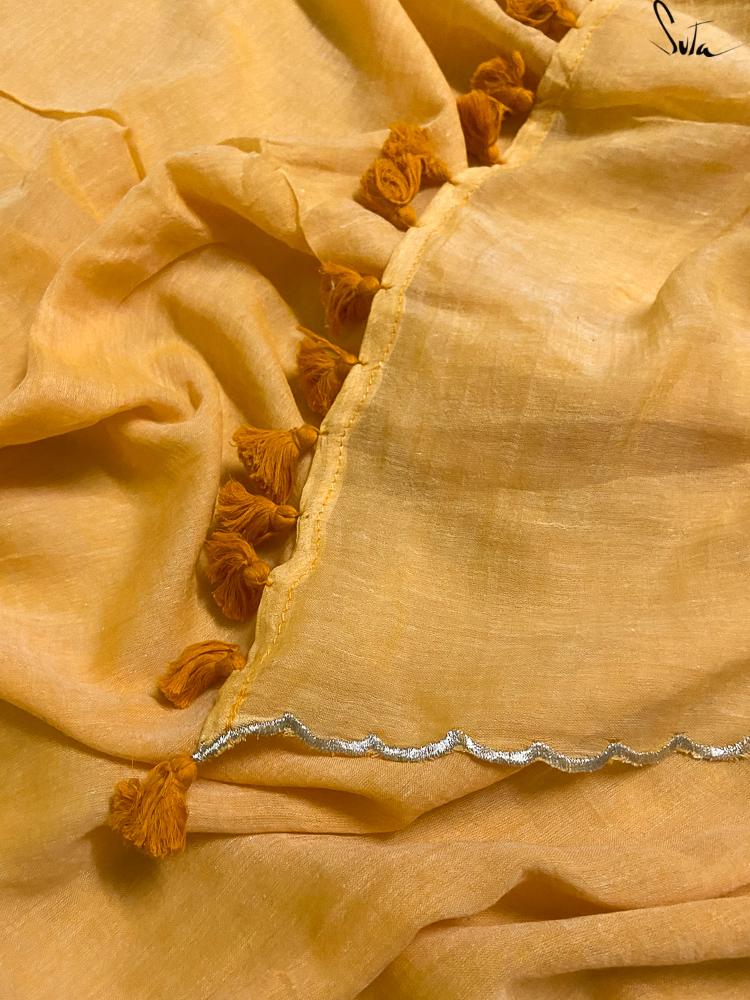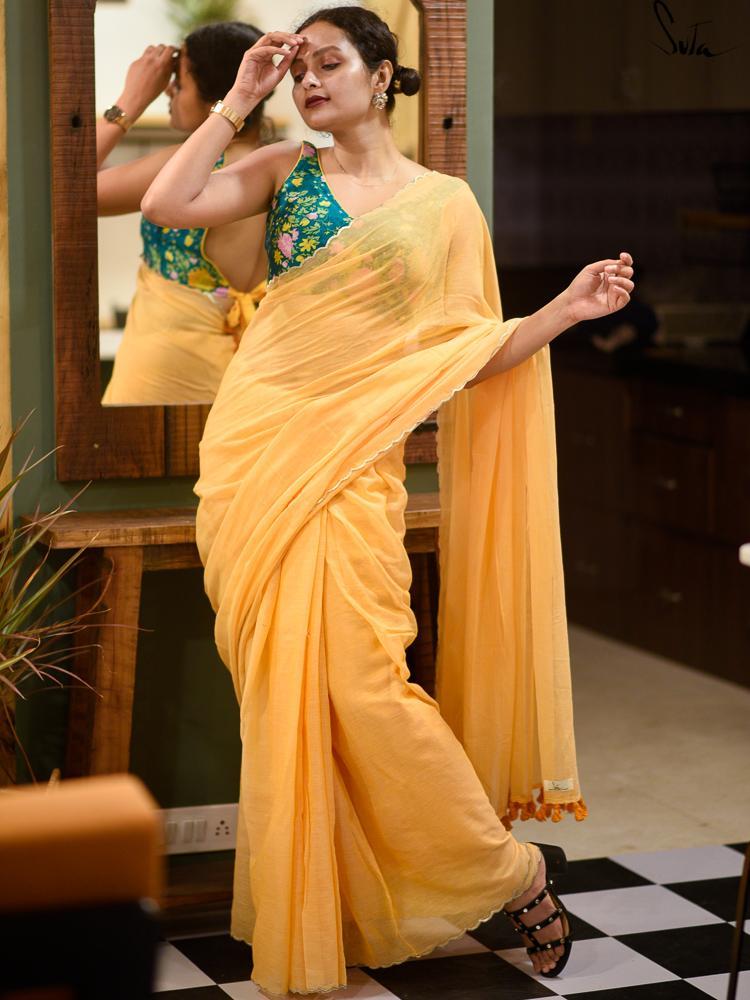 This is a mustard made-in-heaven mul saree with gorgeous machine-embroidered scallops on the border.