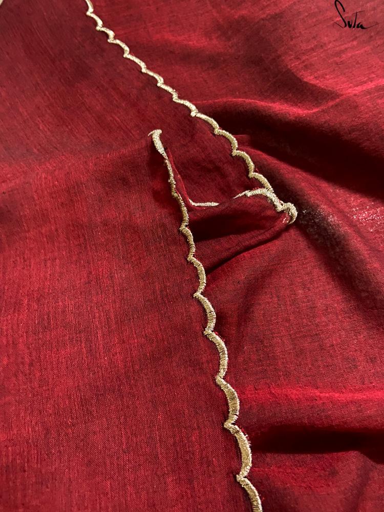 This is a maroon made-in-heaven mul saree with gorgeous machine-embroidered scallops on the border.