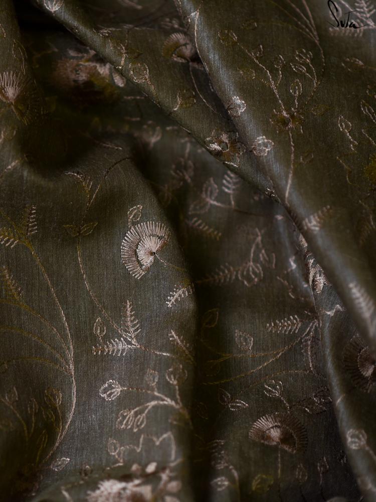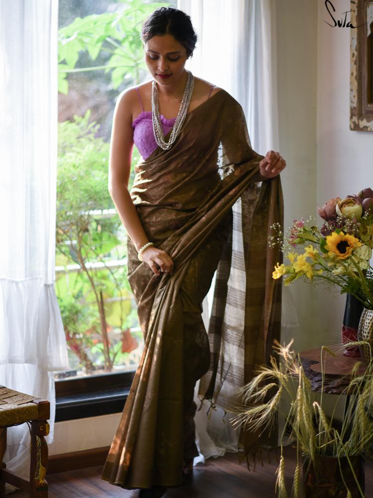 This is a brown coloured saree in poly nylon that comes alive with the delicate machine-embroidered floral designs!