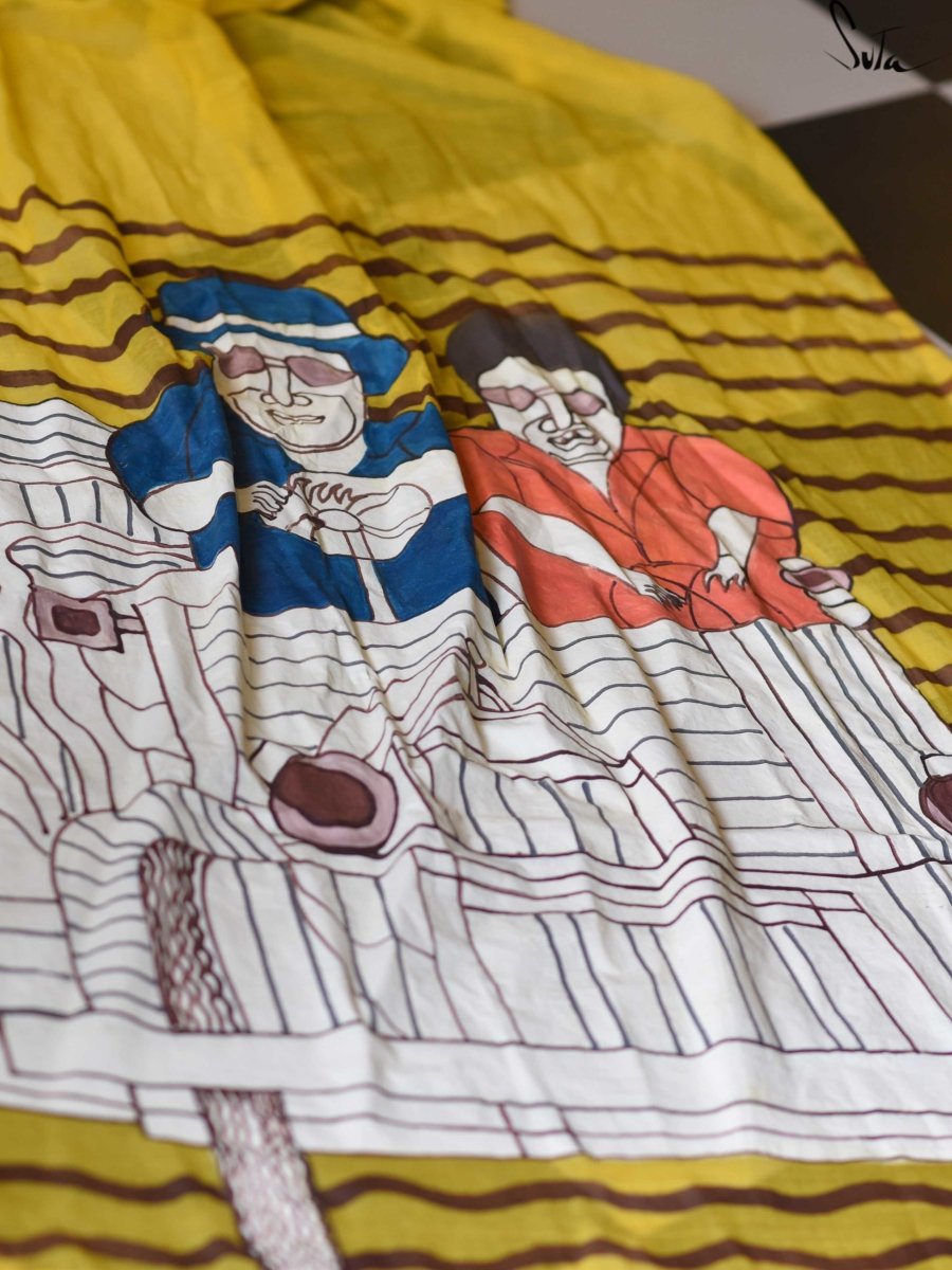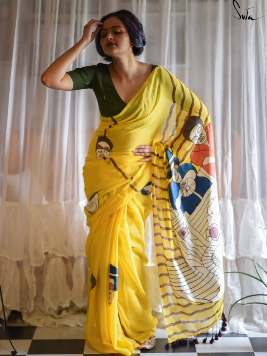 This yellow hand-painted made-in-heaven mul saree is a dream! The beautiful artworks on the sarees from this collection are created by Amrit and replicated on our sarees by Suta’s women artisans.