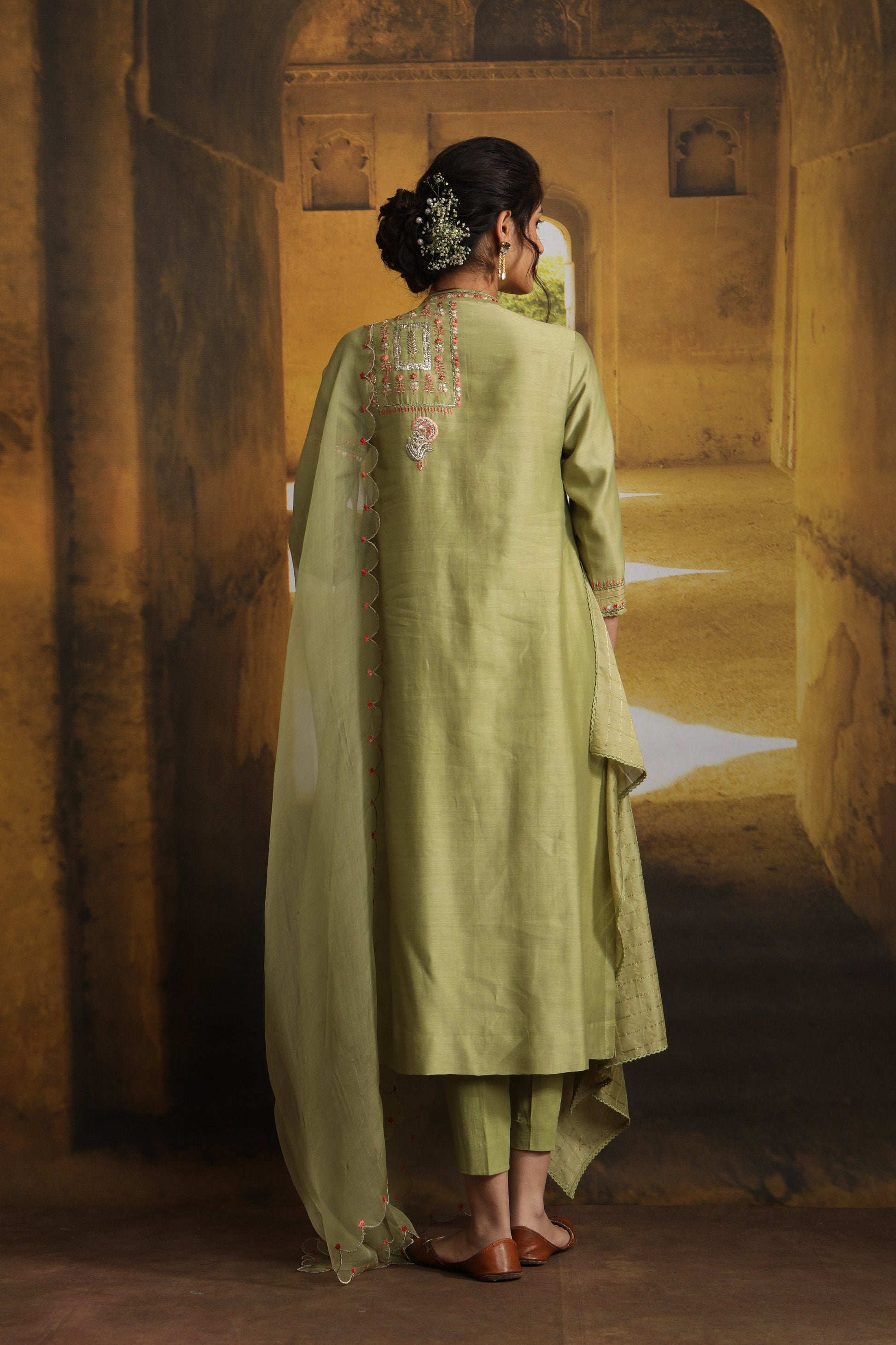 Miniature Painting Inspired Embroidered Olive Green Chanderi Drape Kurta Paired With Matching Scallop Border Organza Dupatta & Cotton straight Pants