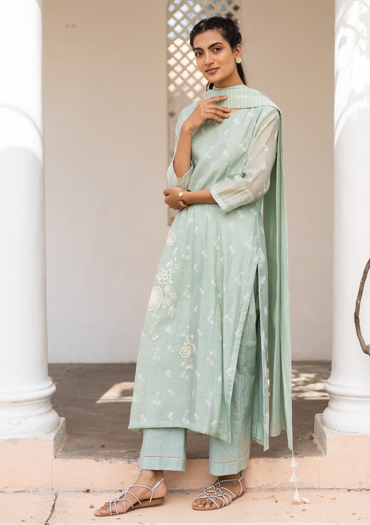 The straight fit sage green kurta features a delicate floral discharge print all over with details of cord embroidery. The kurta is paired with matching lace edge pants and a contrasting stripe print dupatta.