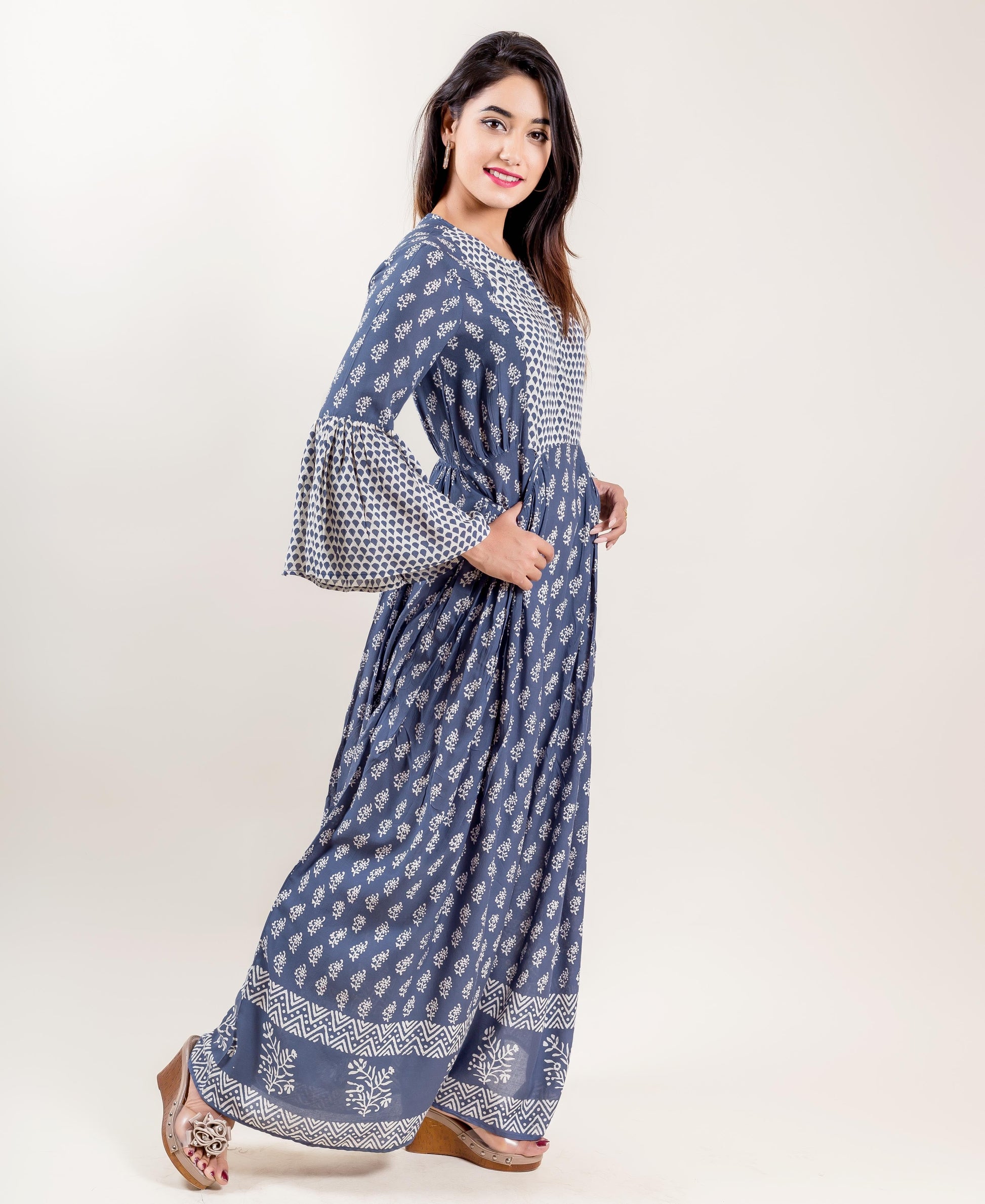 Modal Long Bell Sleeved Indo Western Dress In Blue And Grey