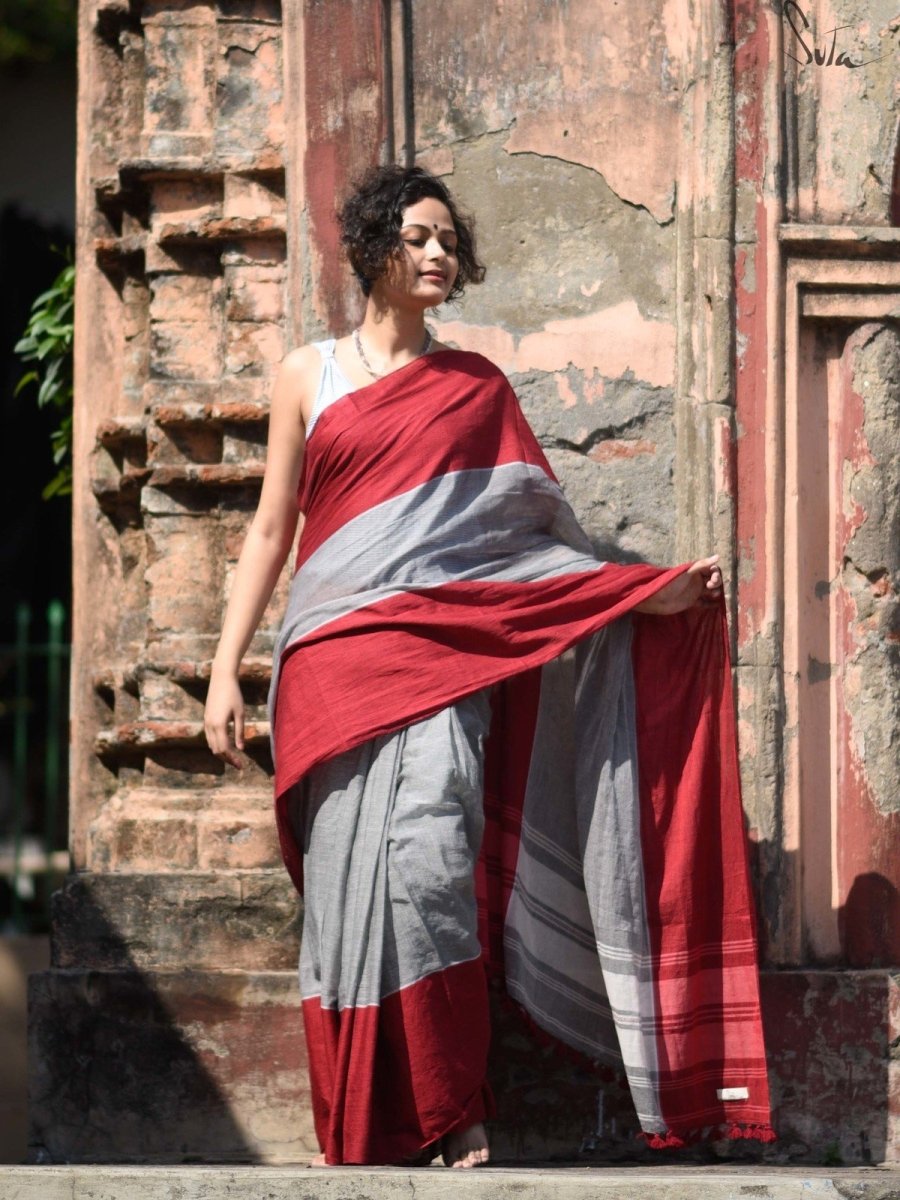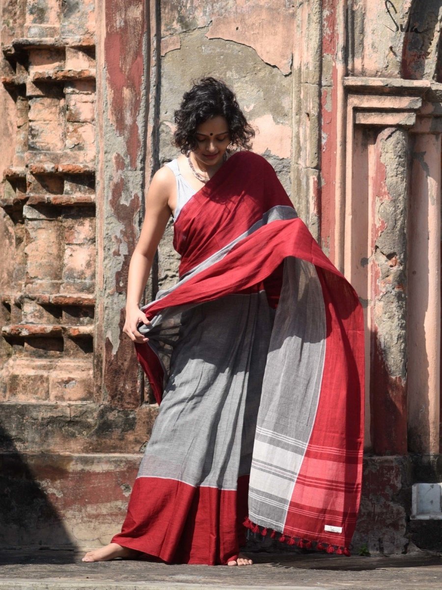 A whole day and night had passed with no word from him and yet she knew that she was all his heart was filled with. In a new country, in a new place, mobile signals and communication lines might have failed him, but his restlessness somehow made it to her. It was just a day for the world but it was infinity for them. She prayed to the sun to go over to the other side and bring his message to her. As the first rays of the day hit her eager face, her lips automatically spread into an uninhibited grin. Her phone had beeped with his message. This enigmatic grey cotton saree with a striking red border makes a statement without any fuss. This one is a classic.