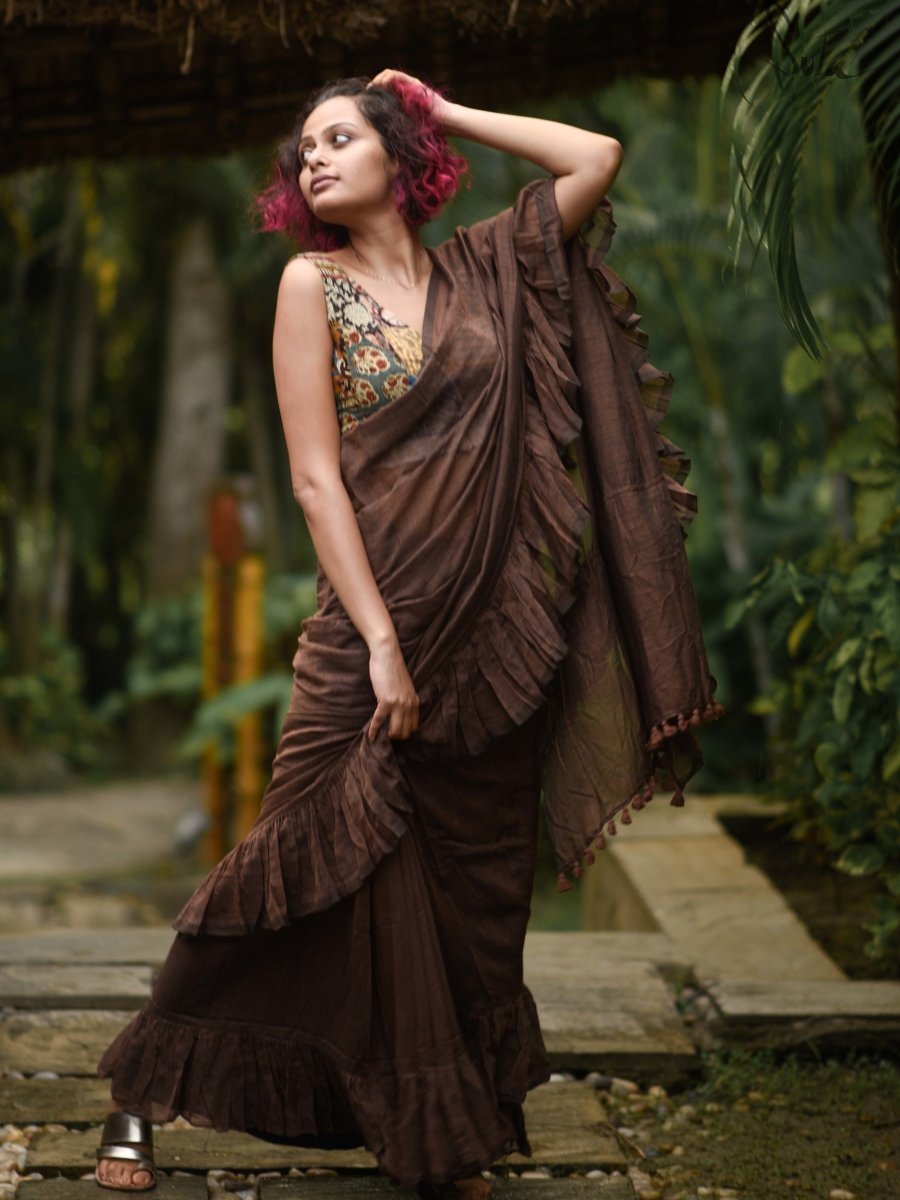 This incredibly luscious brown made-in-heaven mul cotton saree with ruffles is irresistible!
