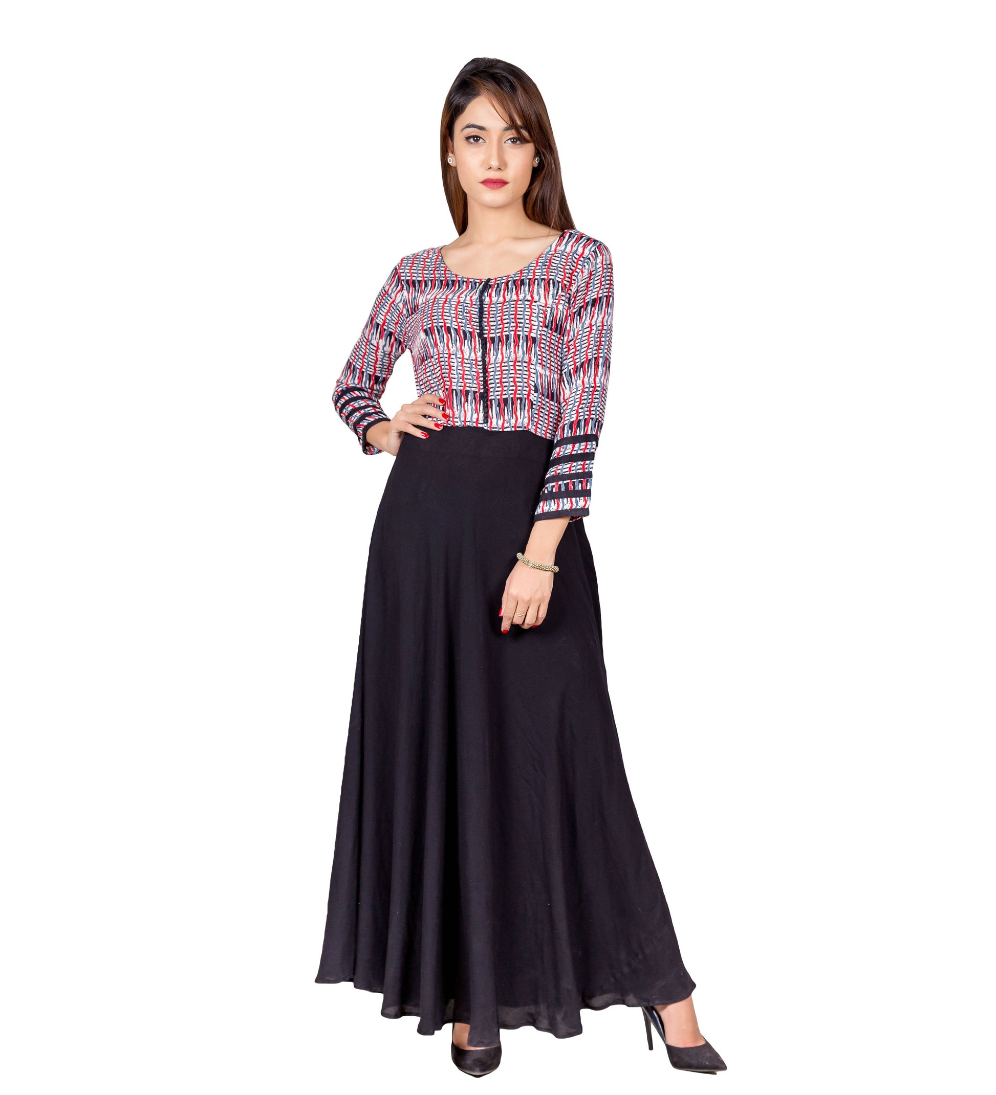 Adorn your closet with the grandest black dress you have been waiting for with the multi color hand block printed indo western long dress from the latest designer Indian fashion house of . Let your love for shopping get optimized with this beautiful fashion piece you must have in your wardrobe. A pure cotton wear with solid trim on the sleeves gives it slim look. The front of the dress is fitted with a straight line of potli buttons to give it that Indian touch alongside the contemporary styling.