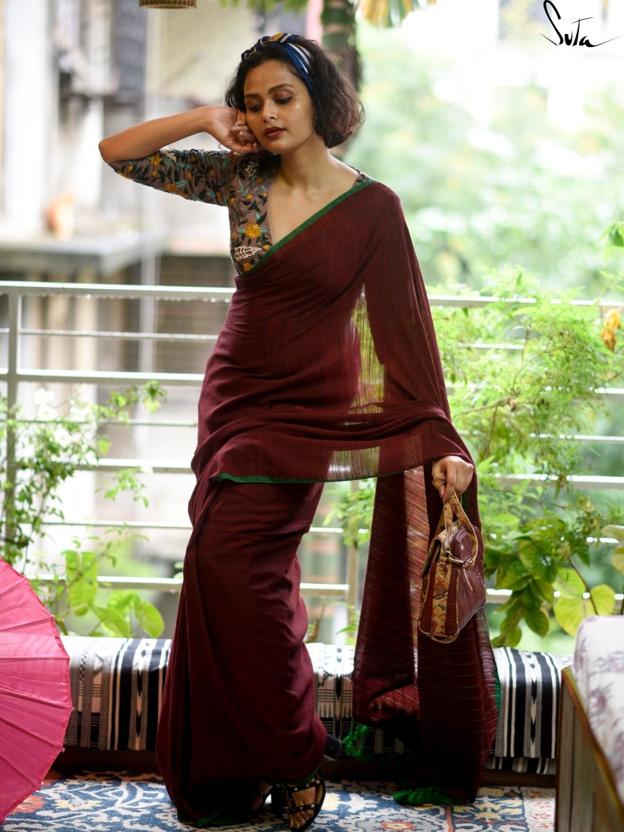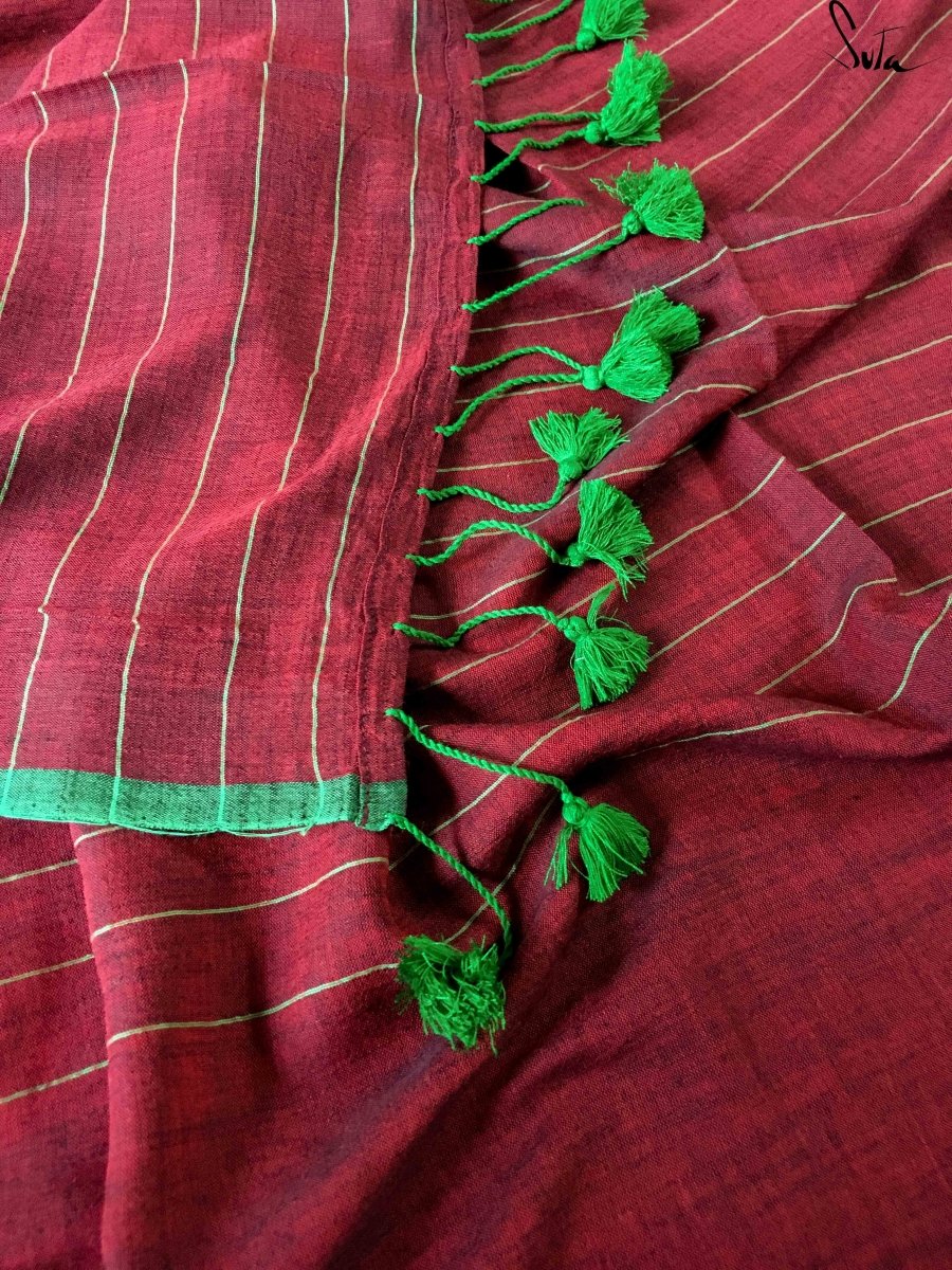 This stunner of a maroon saree in a soft blend of mul and viscose slub is simply gorgeous!