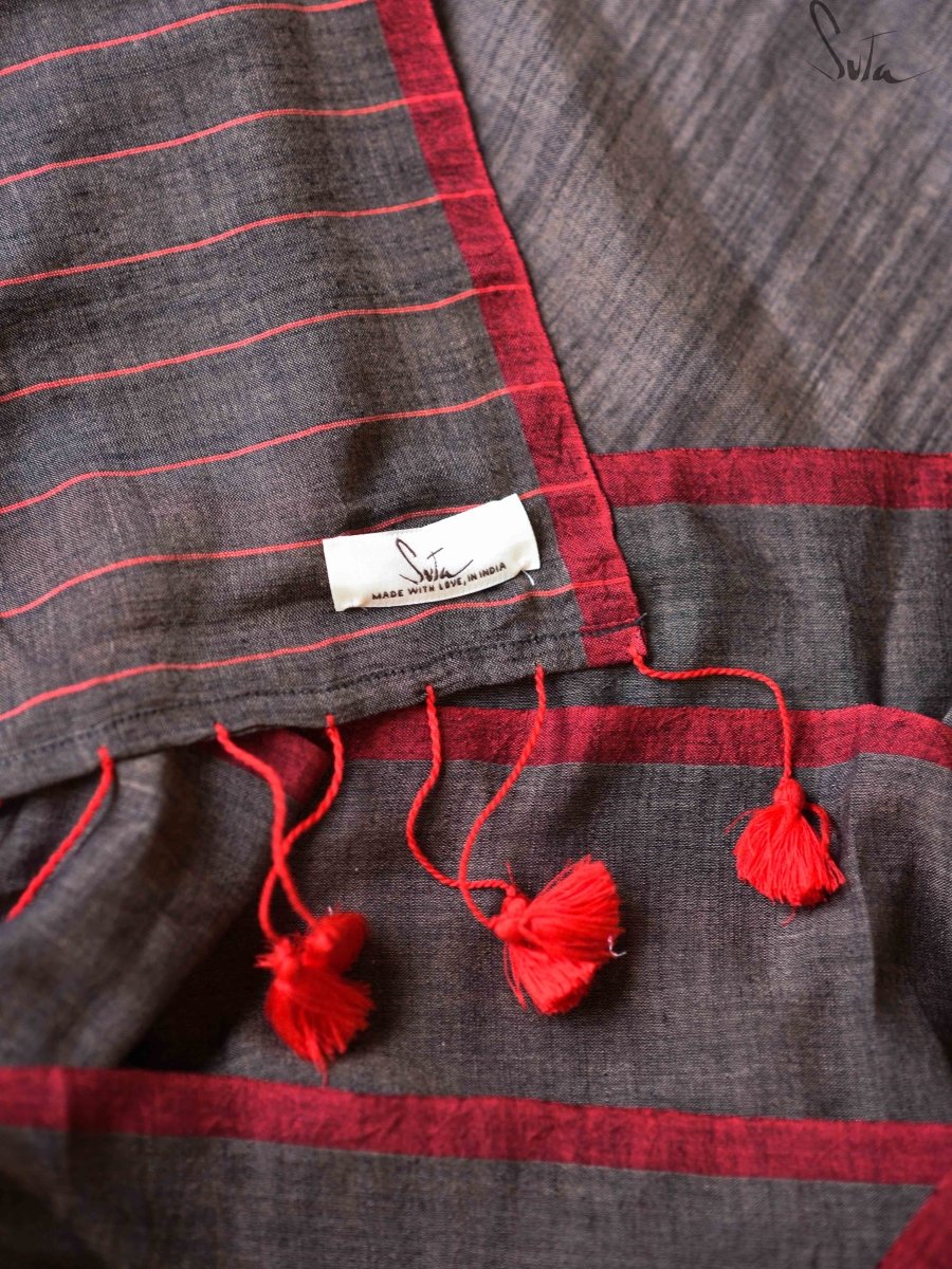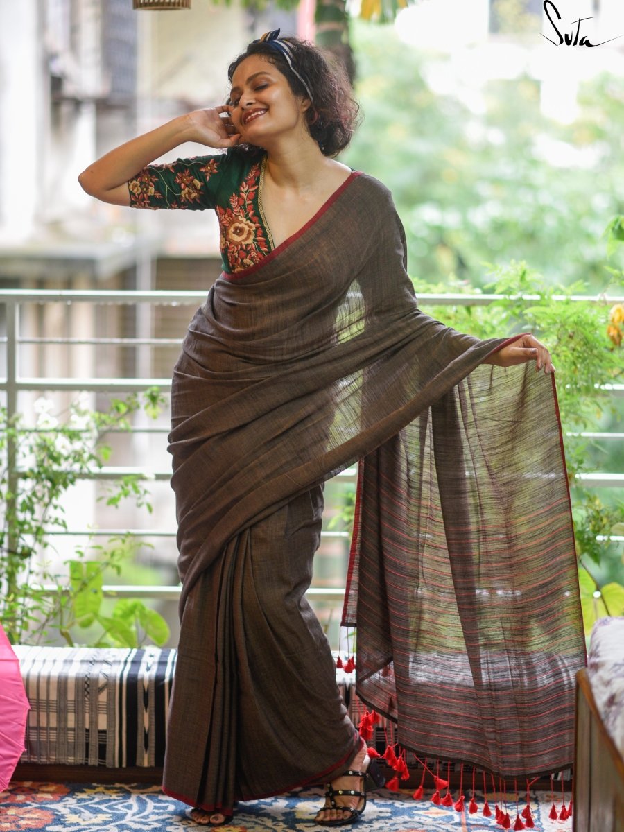 This saree in an amazing brown hue and the softest blend of mul and viscose slub is dreamy!