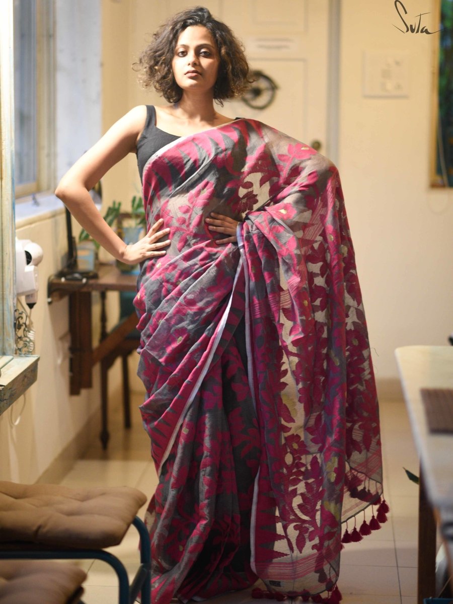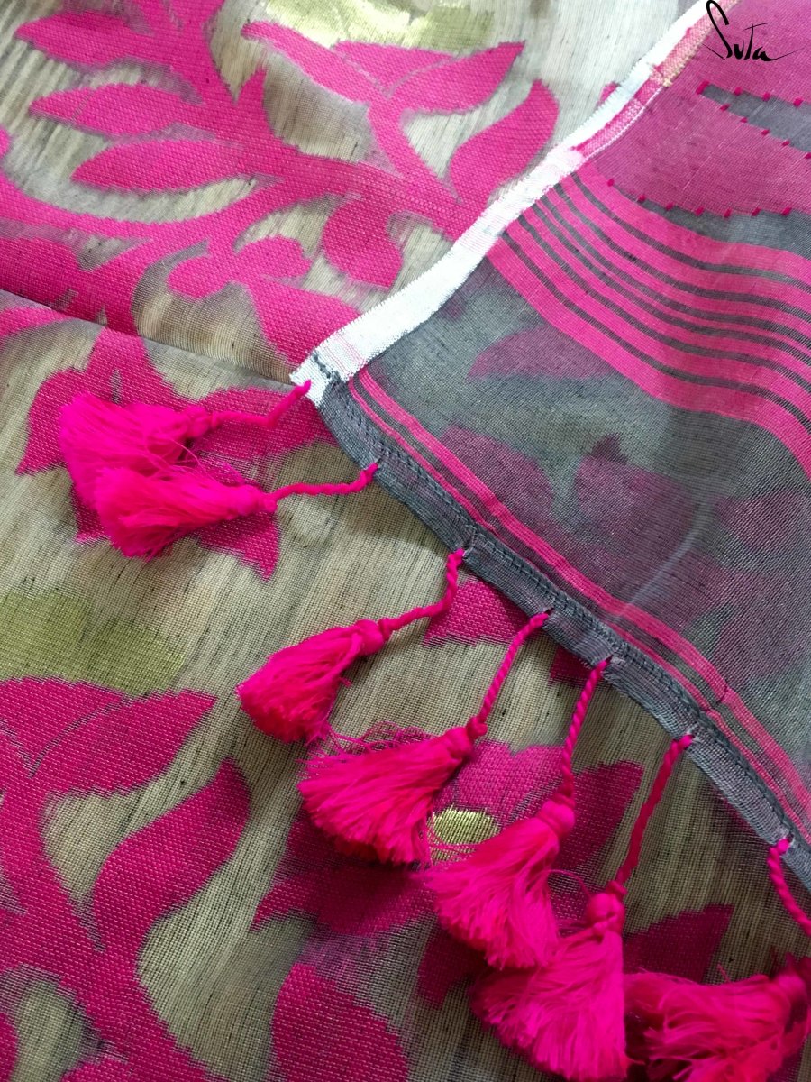 This grey and pink cotton polyester blend saree is a show-stopper. Don’t miss it!