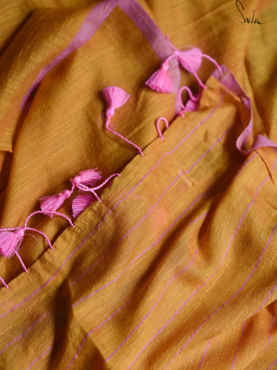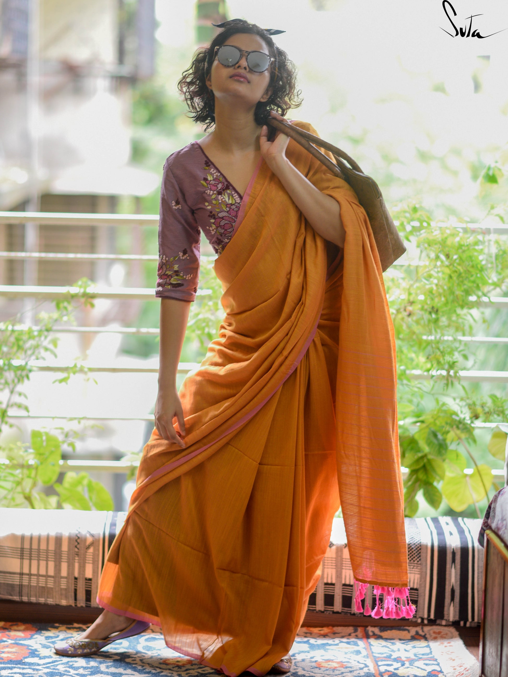 This mustard saree in a soft blend of mul and viscose slub feels like a piece of nature itself!