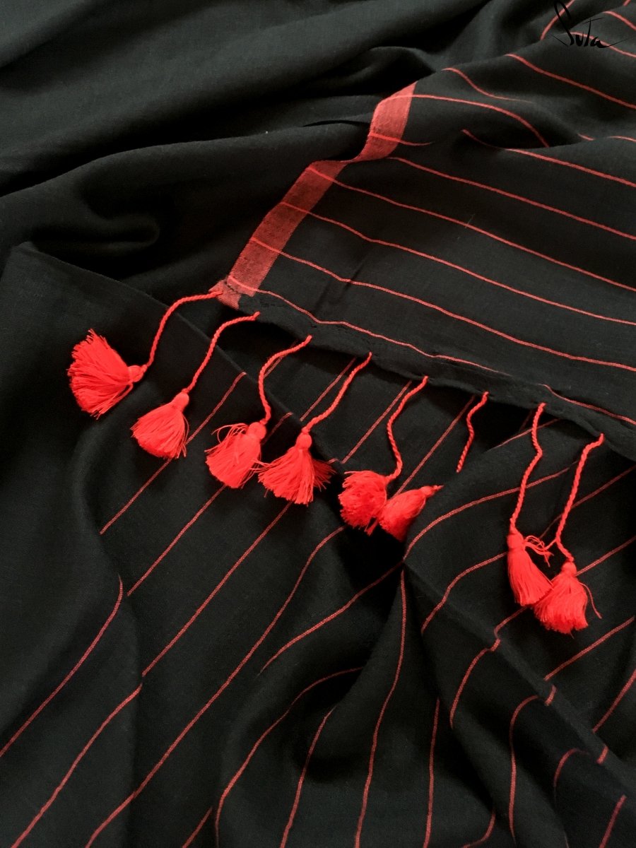 This simple yet stunning black saree in a mul and viscose slub blend is a must-have!