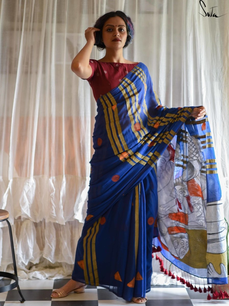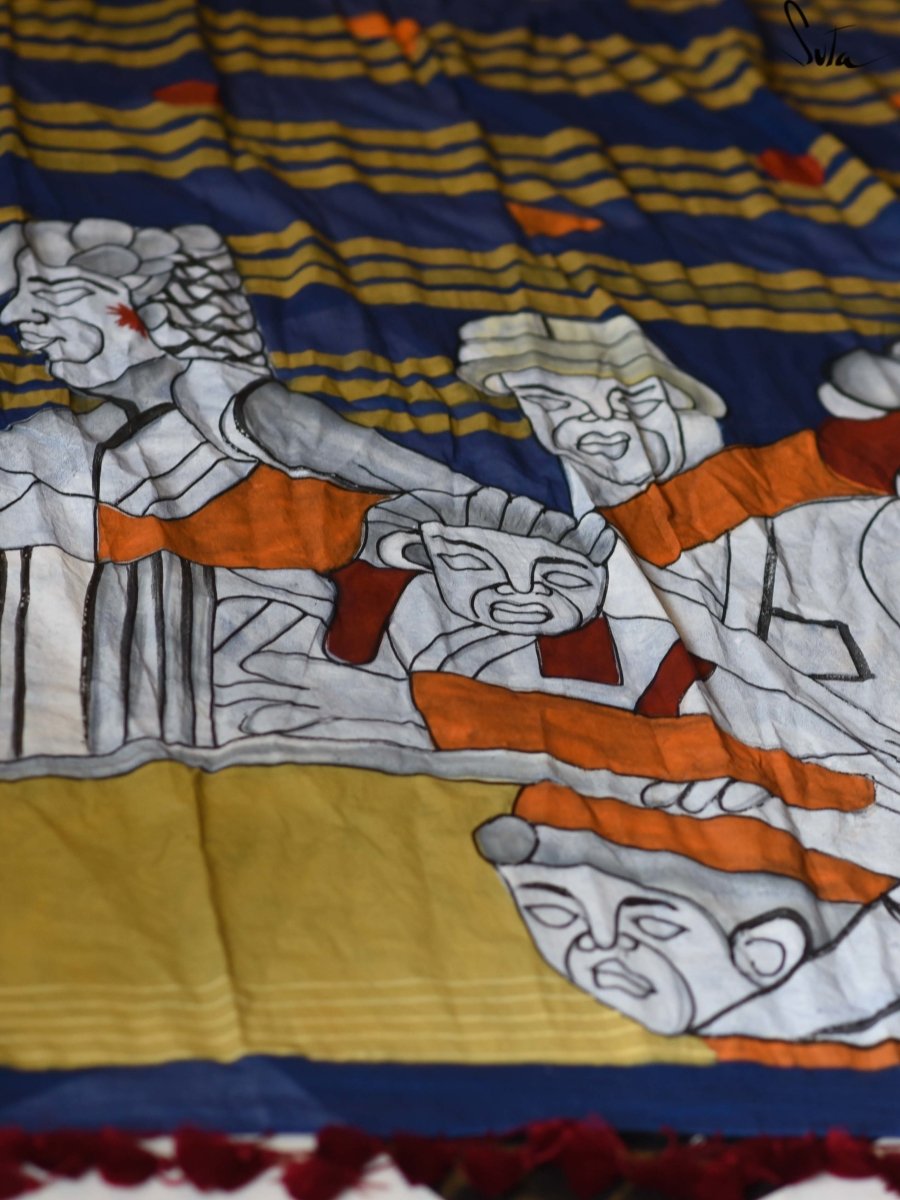 Art comes alive on this blue hand-painted made-in-heaven mul saree.The beautiful artworks on the sarees from this collection are created by Amrit and replicated on our sarees by Suta’s women artisans.