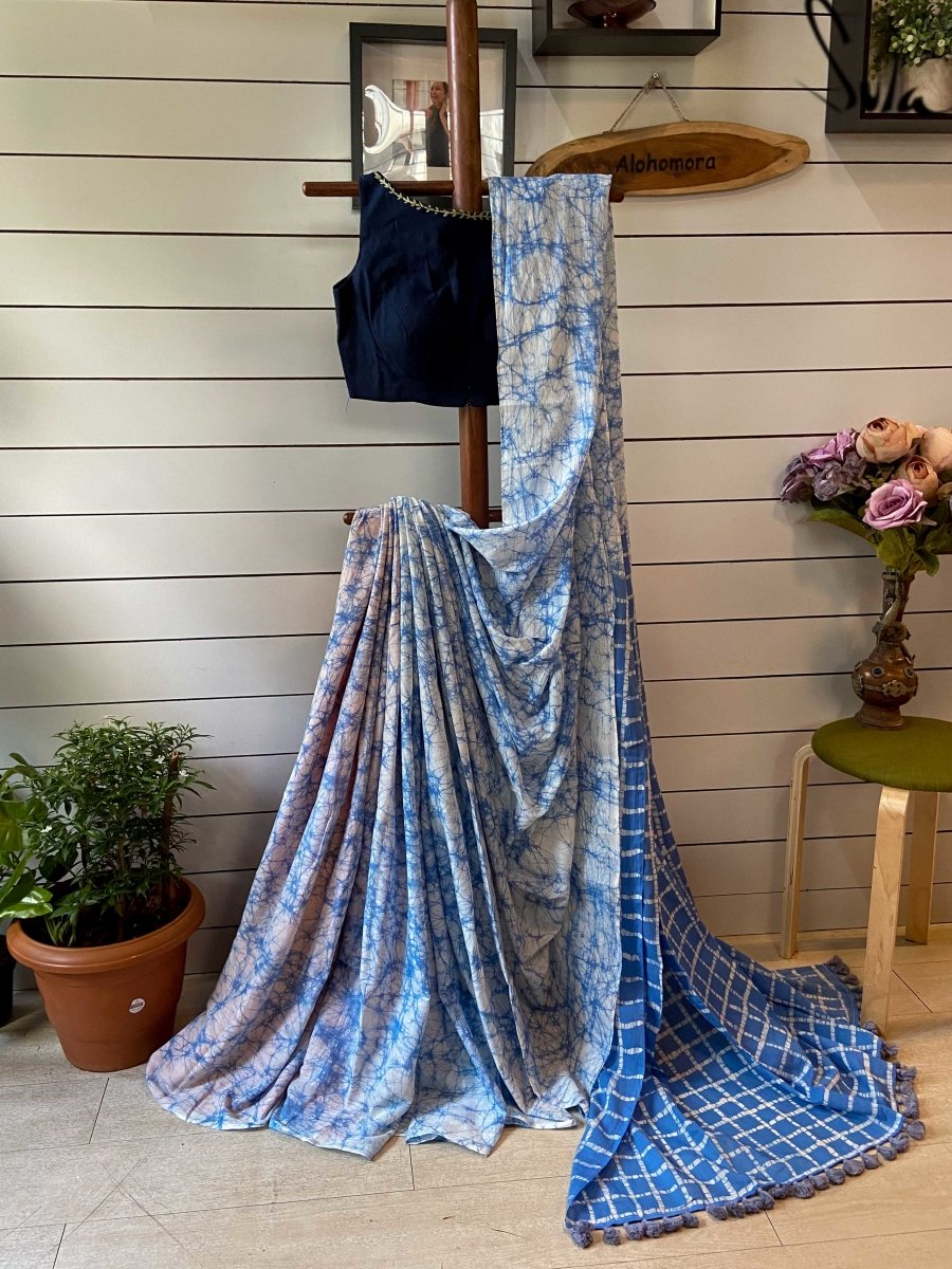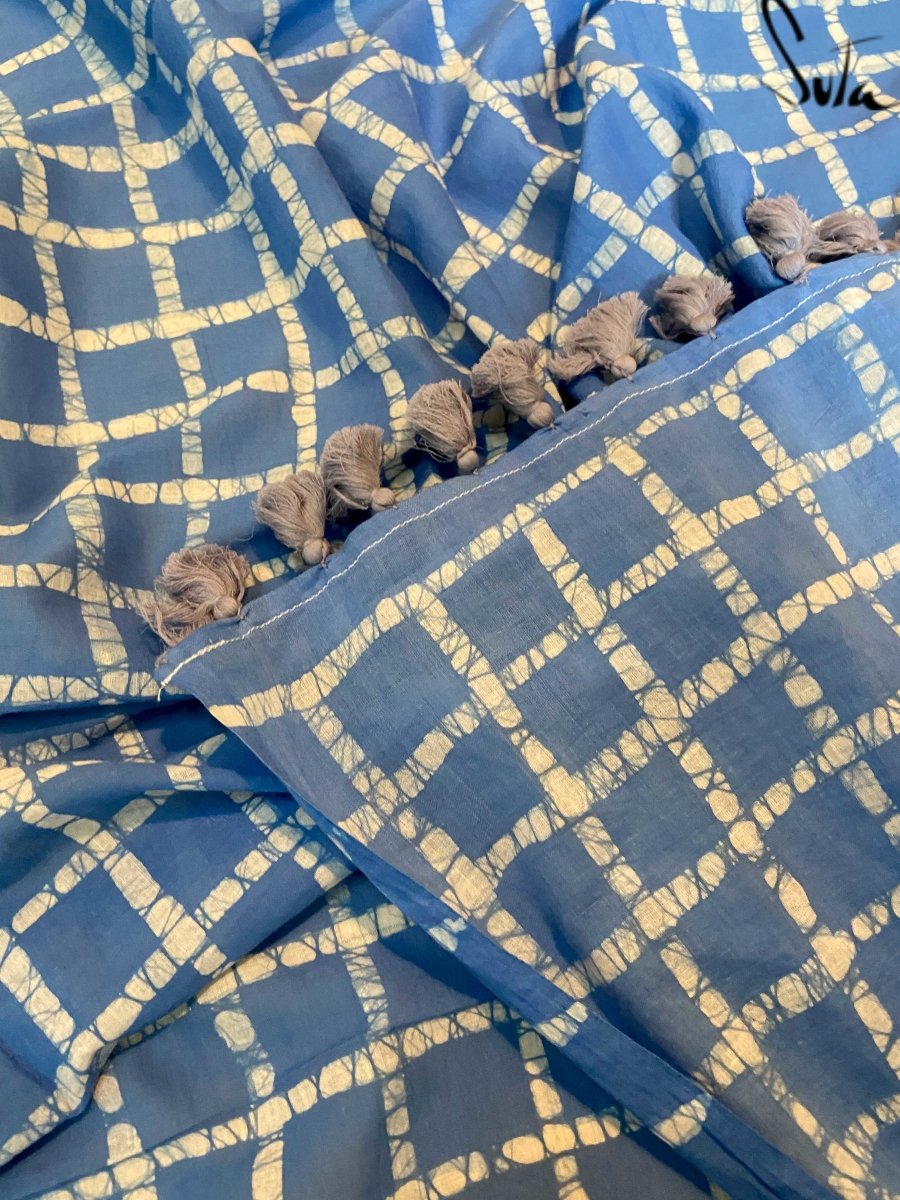 The ancient craft of wax-resist dyeing called Batik adds a timeless charm to this saree. Wax-resist dyeing has been a part of somany ancient civilisations across the world and can be uniquely characterised by thelocal motifs and designs used. Specifically in India, Batik is said to have over 2000 years of history. Materials such as wax or rice starch was used to create the resistance to dye and thus create the Batik designs. The entire process involves various steps such as drawing the basic pattern, redrawing using wax and then applying the dye.Then, the wax is removed after the fabric dries. THis is done multiple times to create various patterns with different colours.The process of dyeing is something that has been passed down by generations of artisans and the stunning designs created by these master craftsmen are timeless.