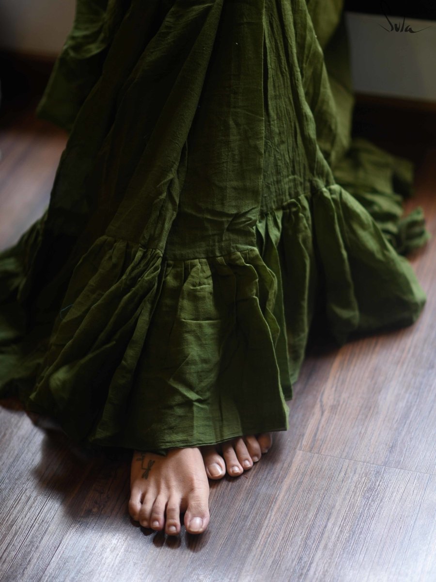 This dreamy ruffled olive saree in made in heaven mul cotton is a dream-come–true!
