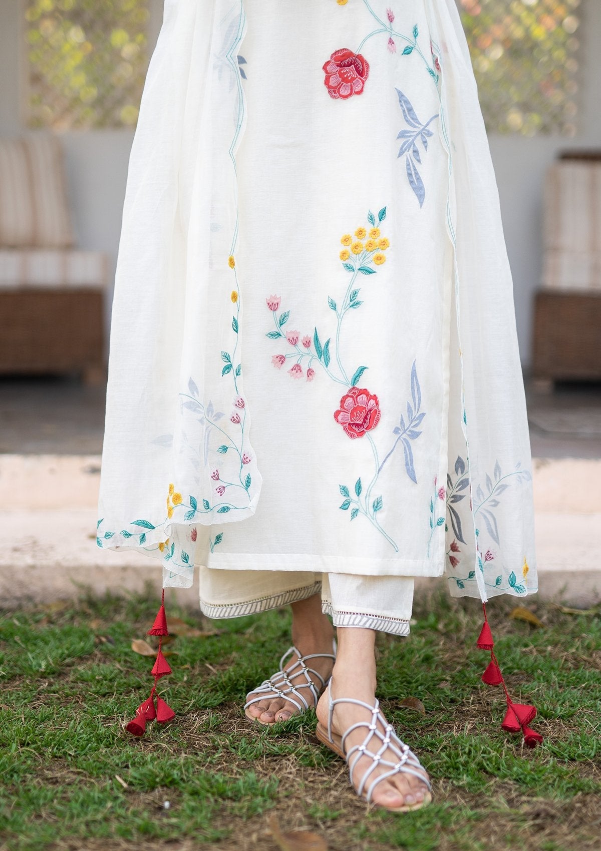 The straight fit classic pearl white kurta features contrasting vibrant floral applique details. The kurta is paired with matching print edge pants and an applique embroidered dupatta.