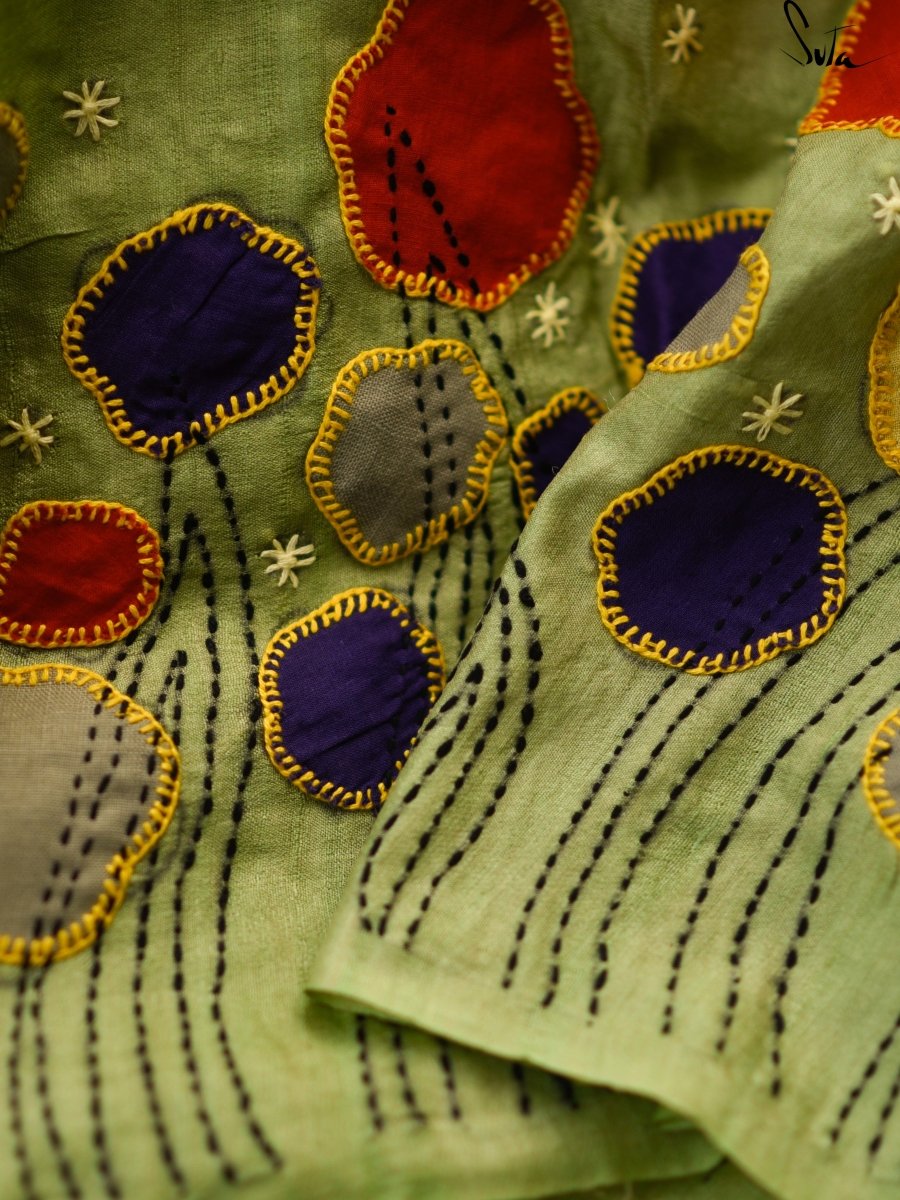 Fabric: Handloom tussar silk with hand embroidery and applique