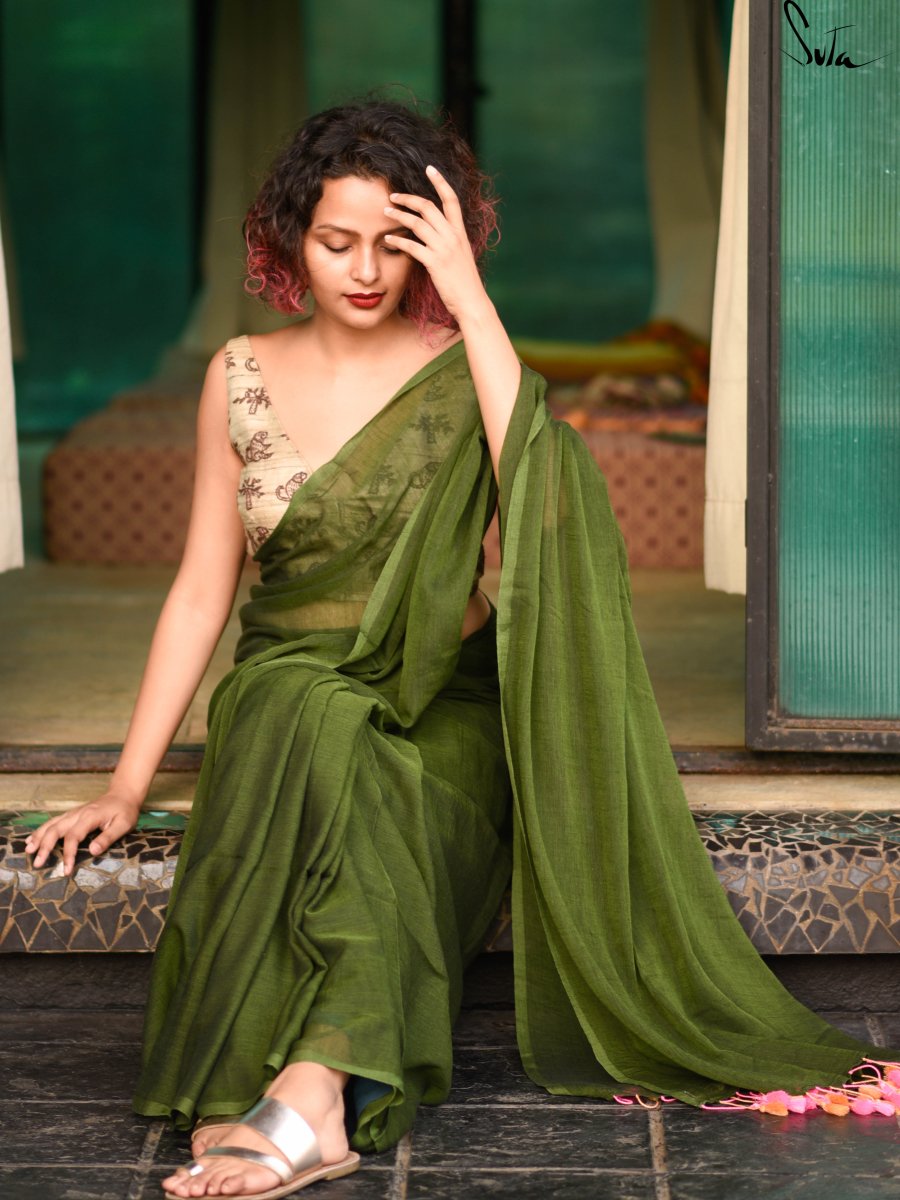 This olive green saree in made-in-heaven mul and modal is a must-have!