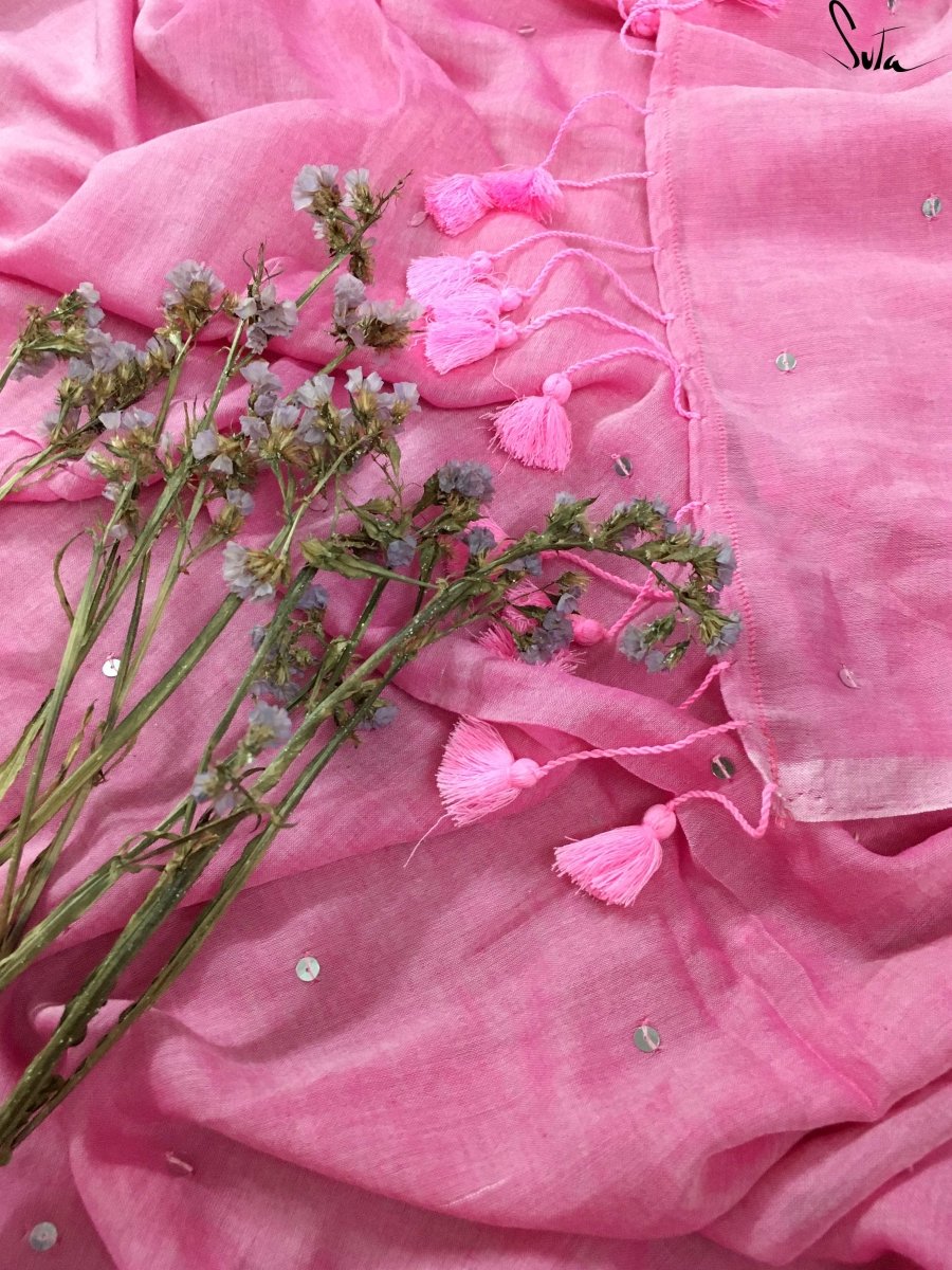 This made-in-heaven mul saree in pink with a sprinkle of chumkis is pure magic!