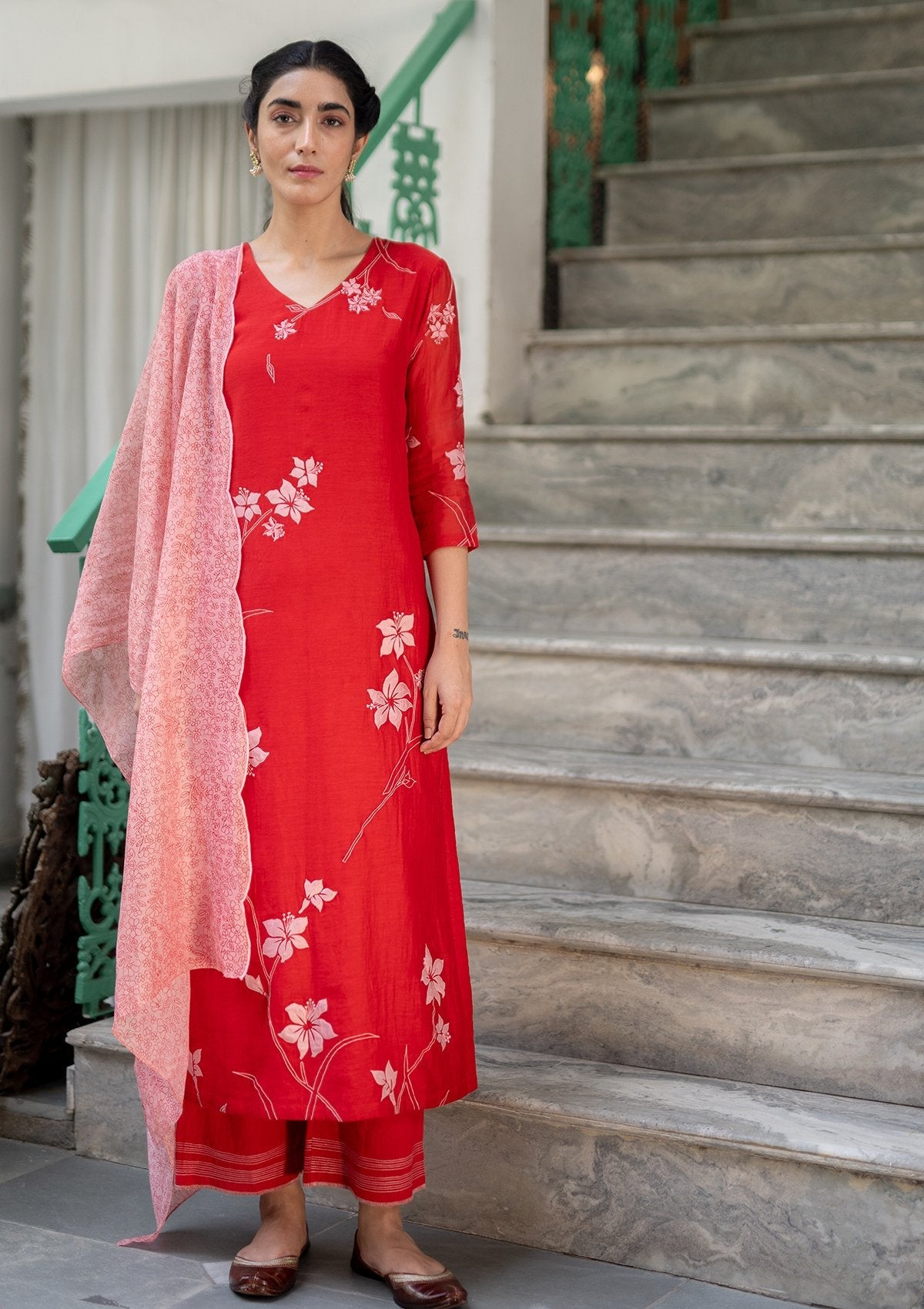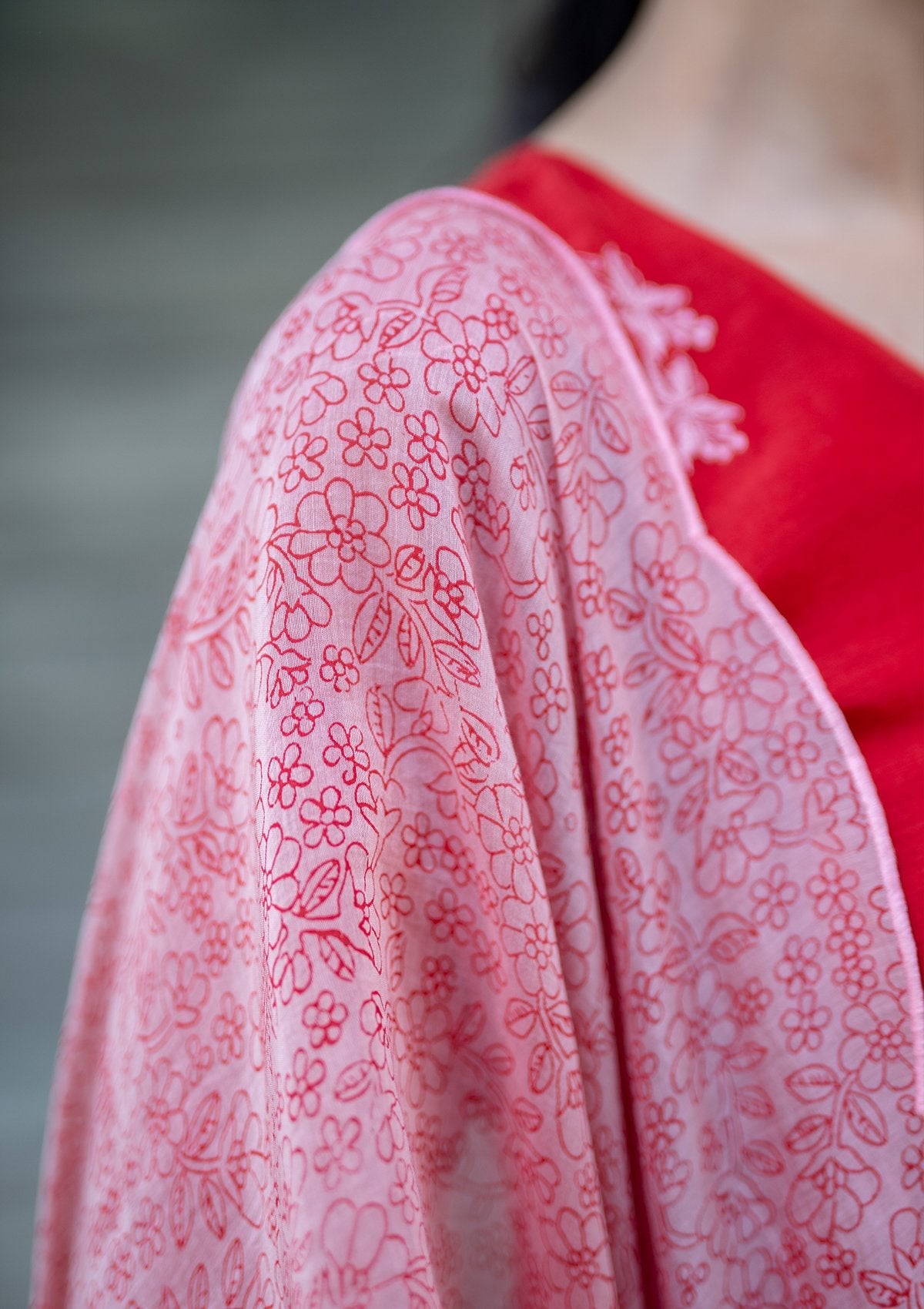 The poppy kurta set features delicate appliqué flowers in a blush rose colour. The kurta is paired with a matching farshi and a contrasting rose blockprinted dupatta.