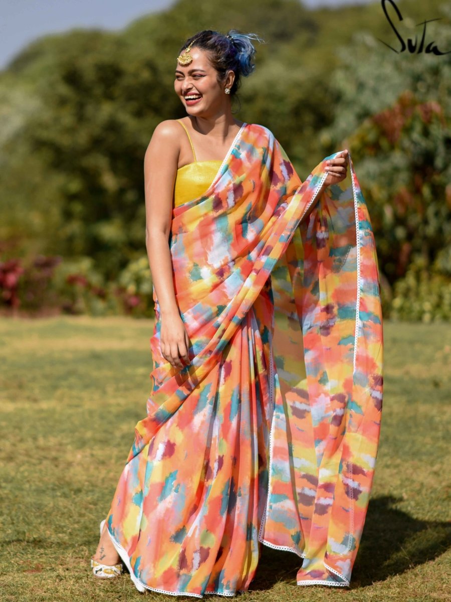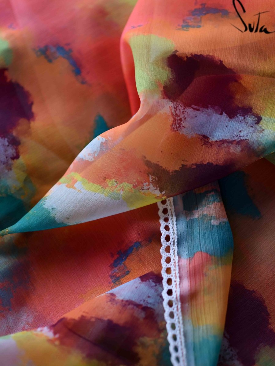 The sarees in this collection come alive with colours as the spirit of Holi takes over. The designs are inspired by the different beautiful elements that this festival is associated with. From pretty bubbles, splashes of colour to the riot of rainbows, the designs exude a fun, bright, lively vibe that will lift you up and dance with you as you let the child in you break free! Digital printing is used to print the designs on poly-Chiffon fabric and this new-age method brings the charm of prints and the convenience of technology together. In this method, designs from a computer or any electronic device are directly printed onto the fabric. Digital printing is considered to be a major evolution in printing methods and has opened up varied design possibilities with it. The delicate lace on the border of the sarees add just that touch of charm that you can resist!