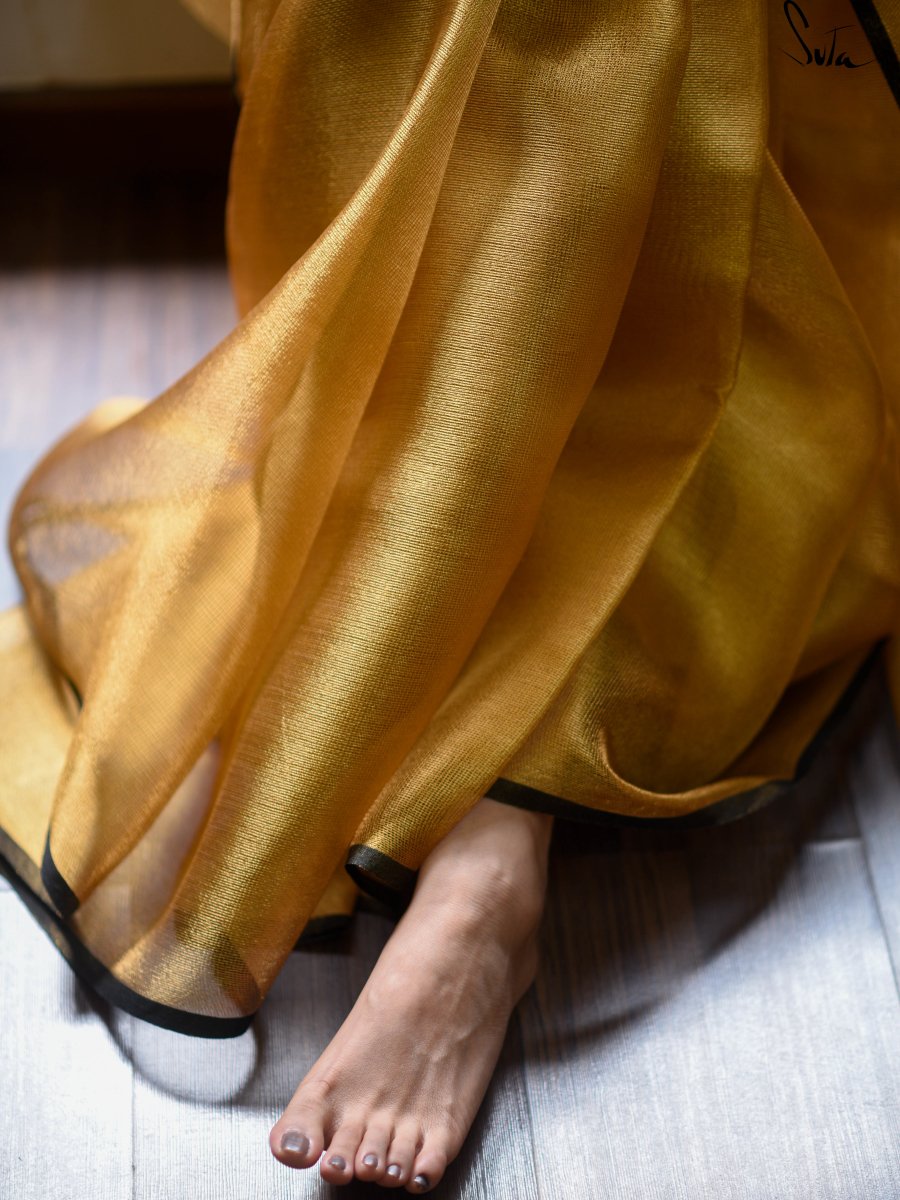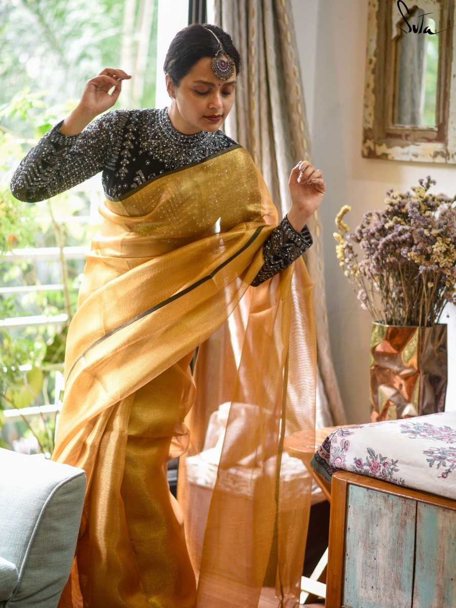 This beauty of a zari netted saree in gorgeous gold hue is a dream come true!
