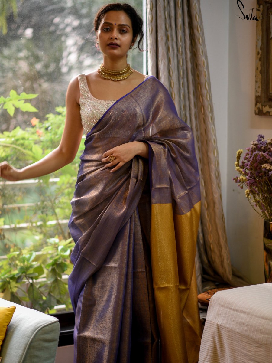 This saree is a blend of linen with zari that gives the fabric an ethereal look and feel! Zari has always been used to infuse that special glow, making fabrics look festive and full of shine. As the zari celebrates you by building a halo of light around you, revel in the beauty and join in the celebration!
