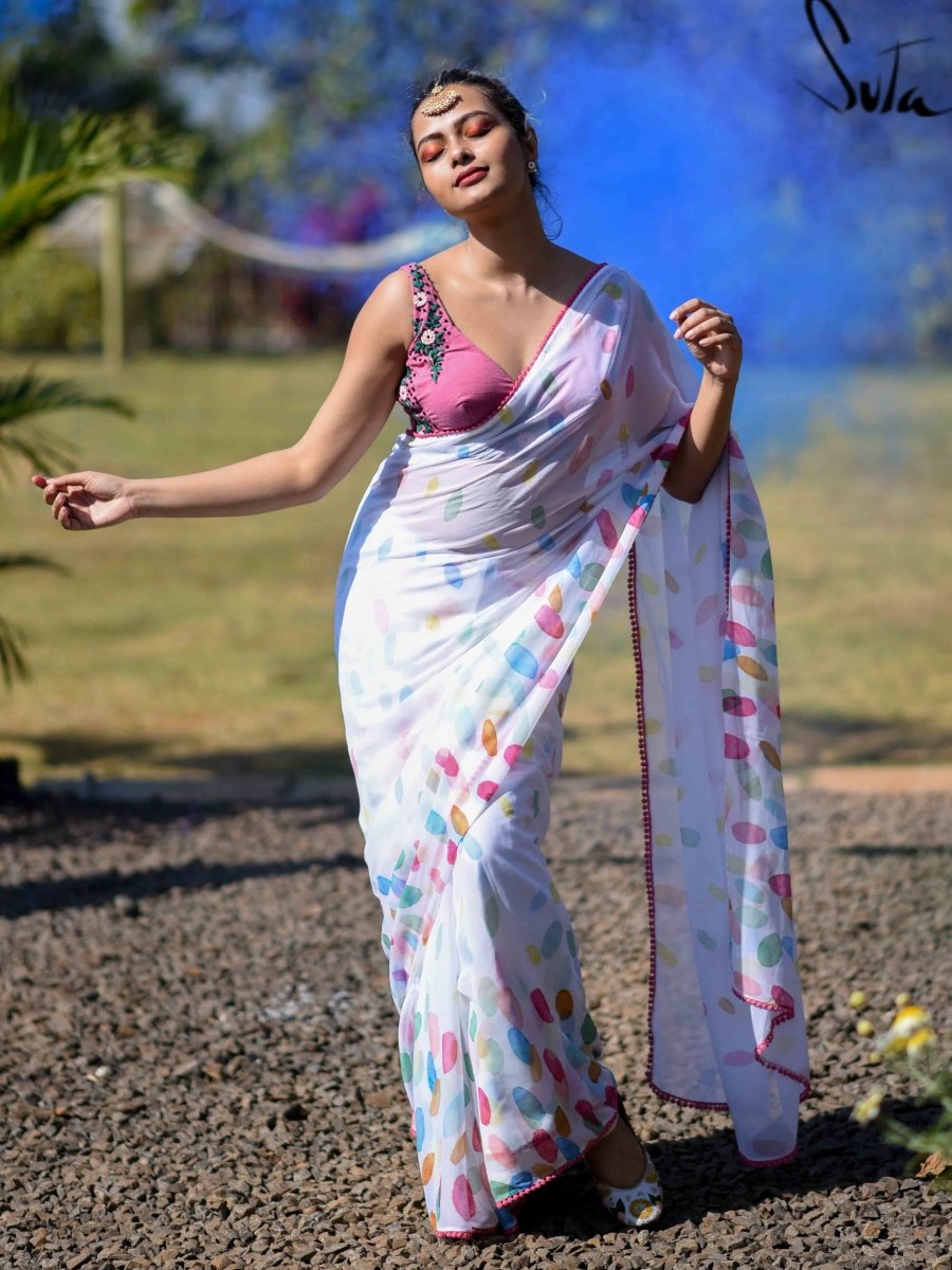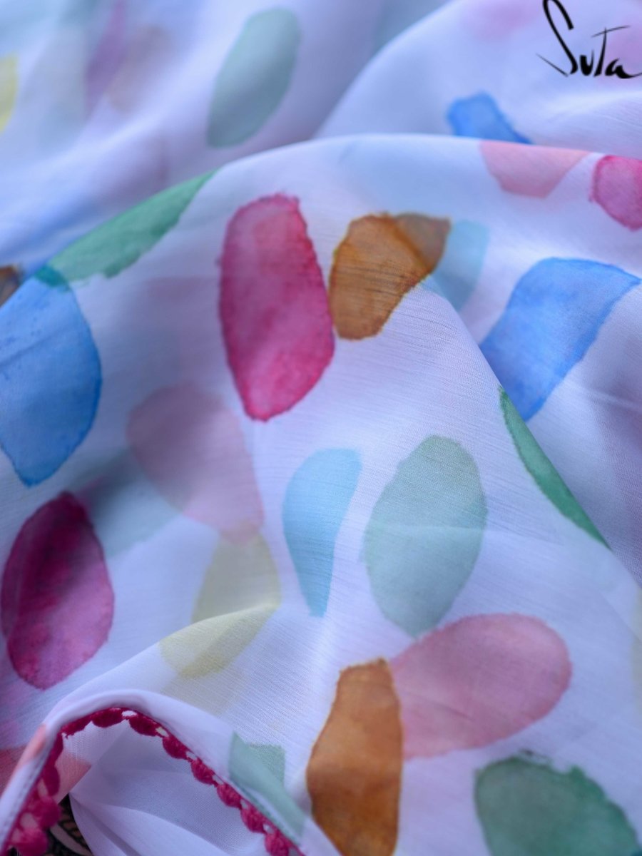 This white and multi-coloured chiffon saree with beautiful digital-printed design exudes fun!