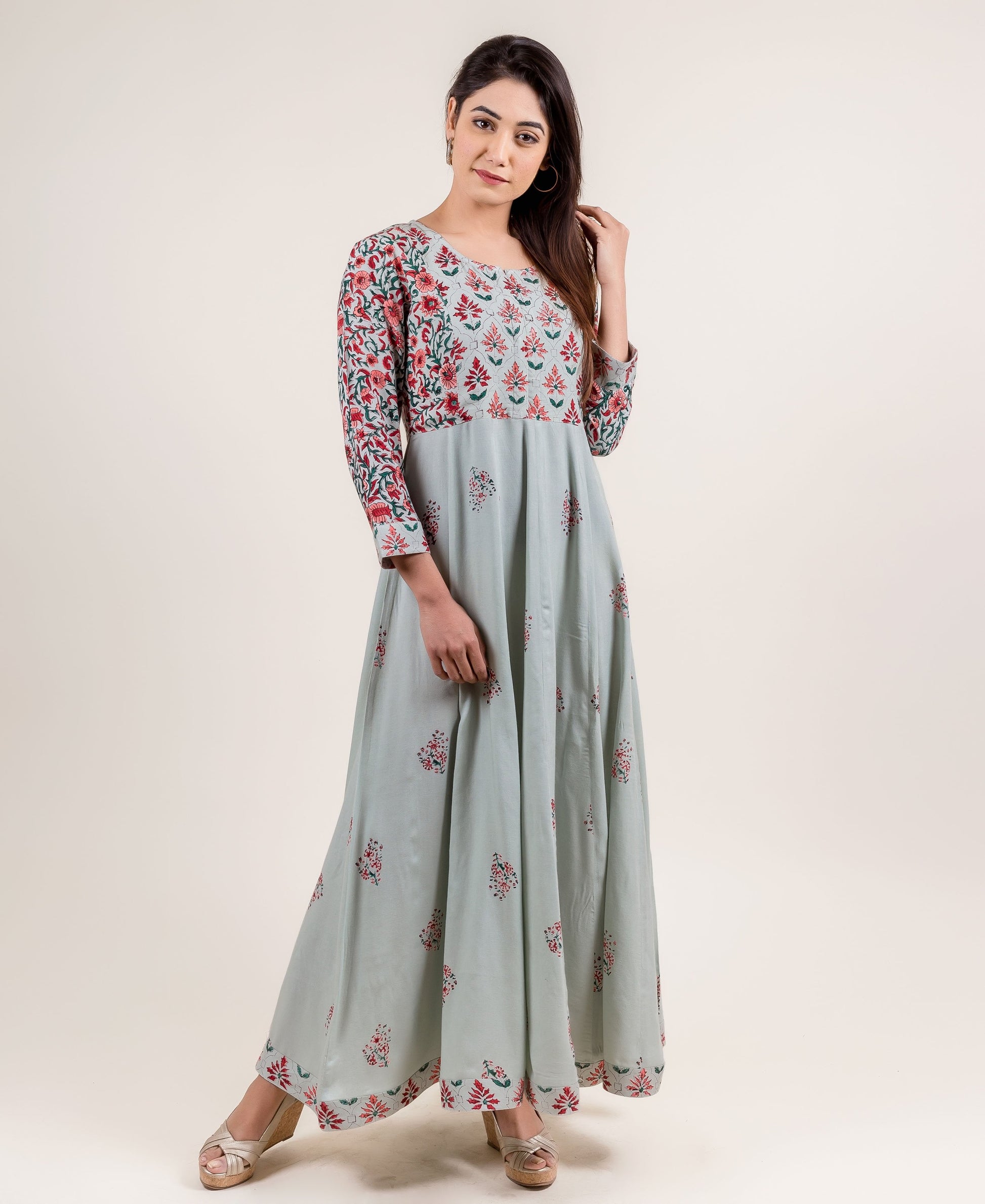 This ravishing anarkali long dress in mint will stun all-round the family gathering and make you look like a glamorous diva. The quarter sleeves, round neckline, peach buti and jaal prints along with unique styling make this rayon number an ideal ensemble to impress everyone when you are wear this and make all your occasion super special.