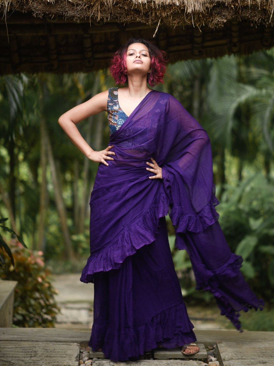 This irresistible purple saree in made-in-heaven mul cotton with ruffles is simply gorgeous!