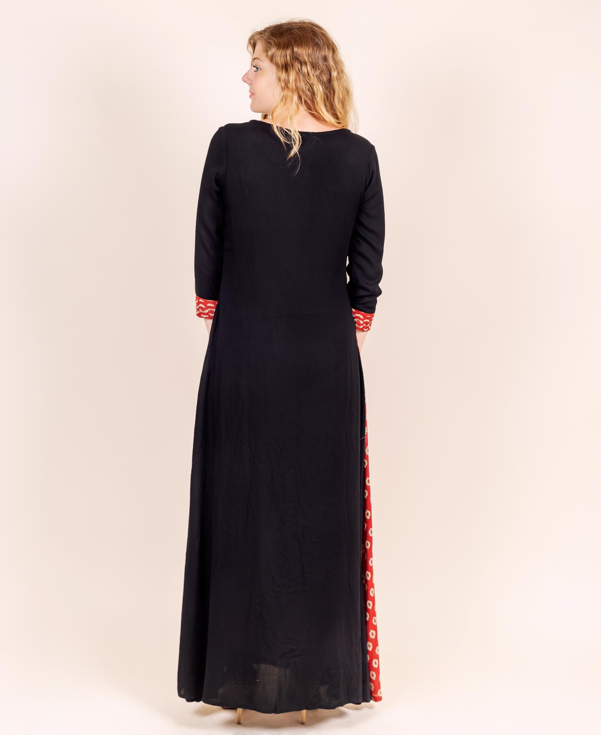 Experience splendour and exclusivity with this fabulous hand block printed scoop Neck Floor Length Wrapper Dress from the brand new arrivals of the Indo western dresses collection by fashion house. This fashion piece is created with innovating an amalgamation with tradition and modernity. This is manufactured with soft and soothing rayon fabric with hand block print which is made in a wrapper style dress. The neck is a scoop style with three fourth sleeves and flared floor length dress.