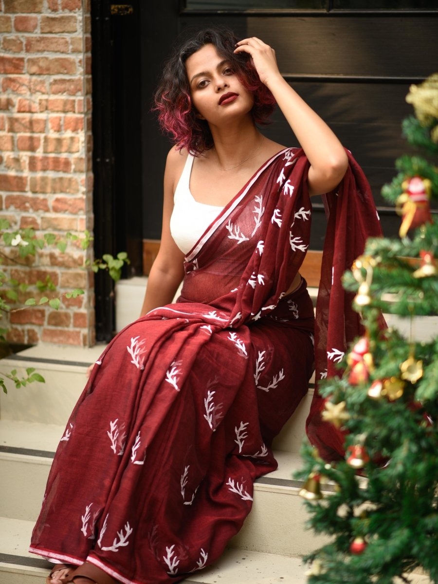This Kochu Pata made-in-heaven mul saree with hand blocked details is dreamy! It has white detailing and is 5.5 metres long.