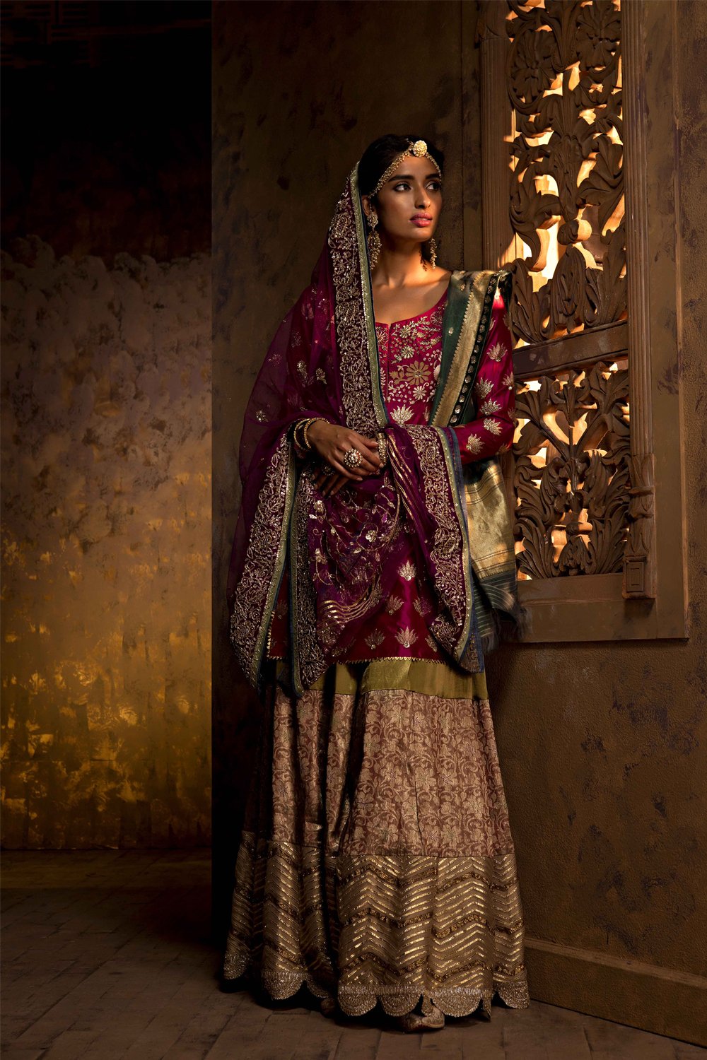 Zardozi Embroidered Royal Pink Chanderi Kurta, Floral Three Panel Sharara, Heavily Embroidered Wine Tulle Dupatta & An Emerald Green Dupatta With Gold Motifs & Woven Border.