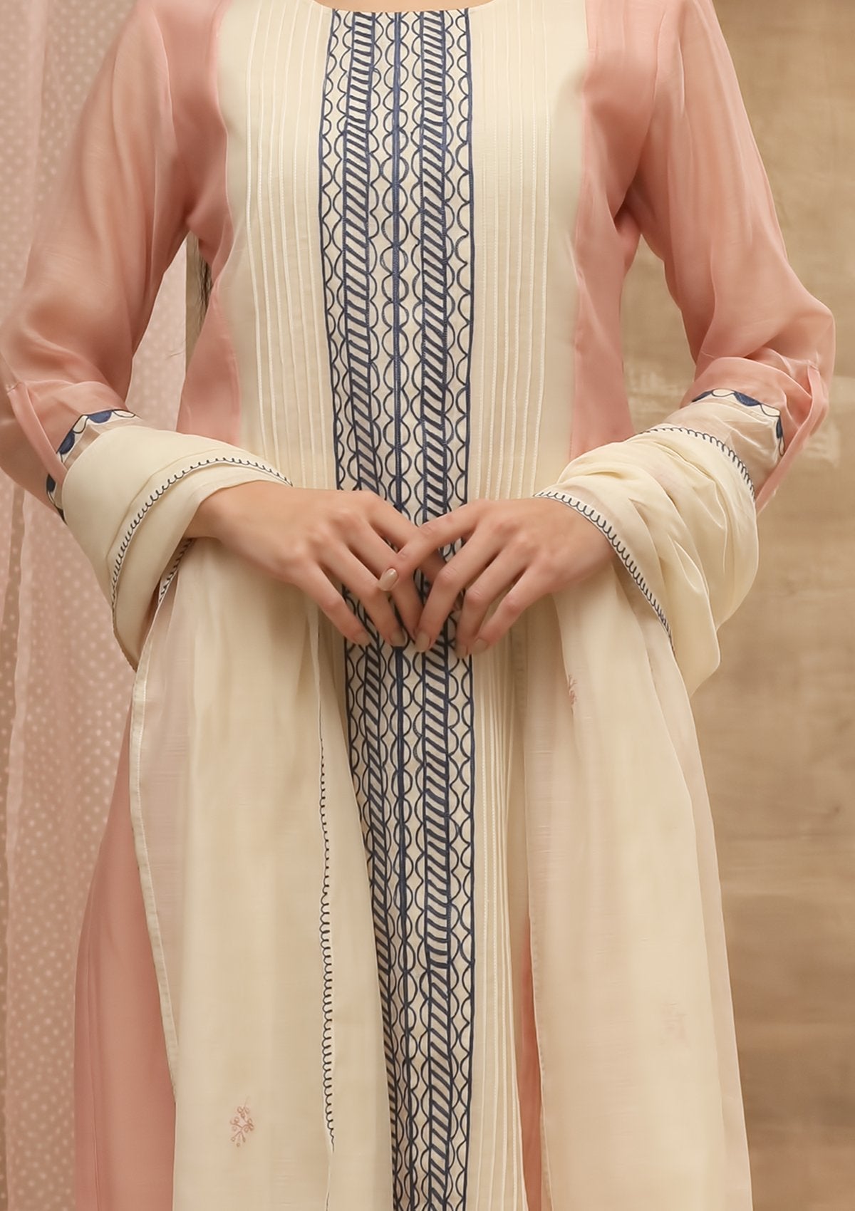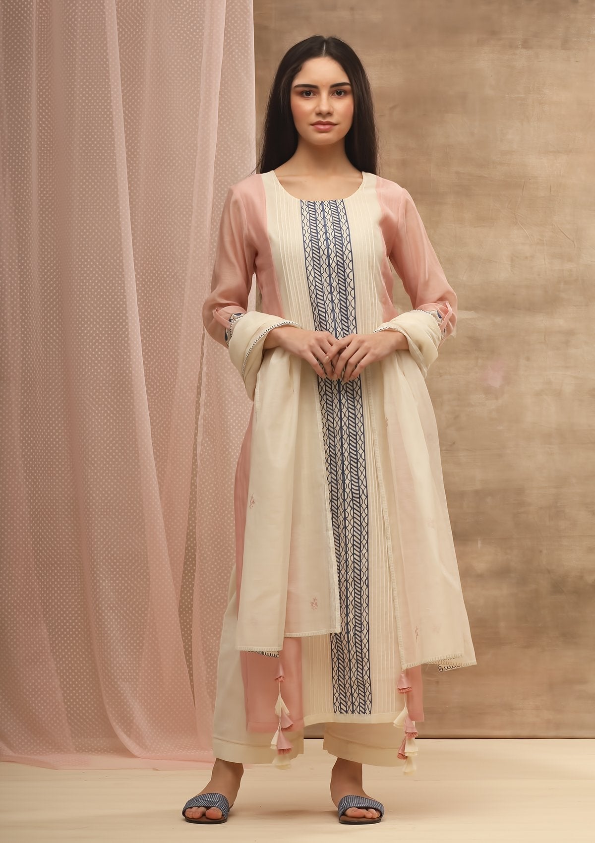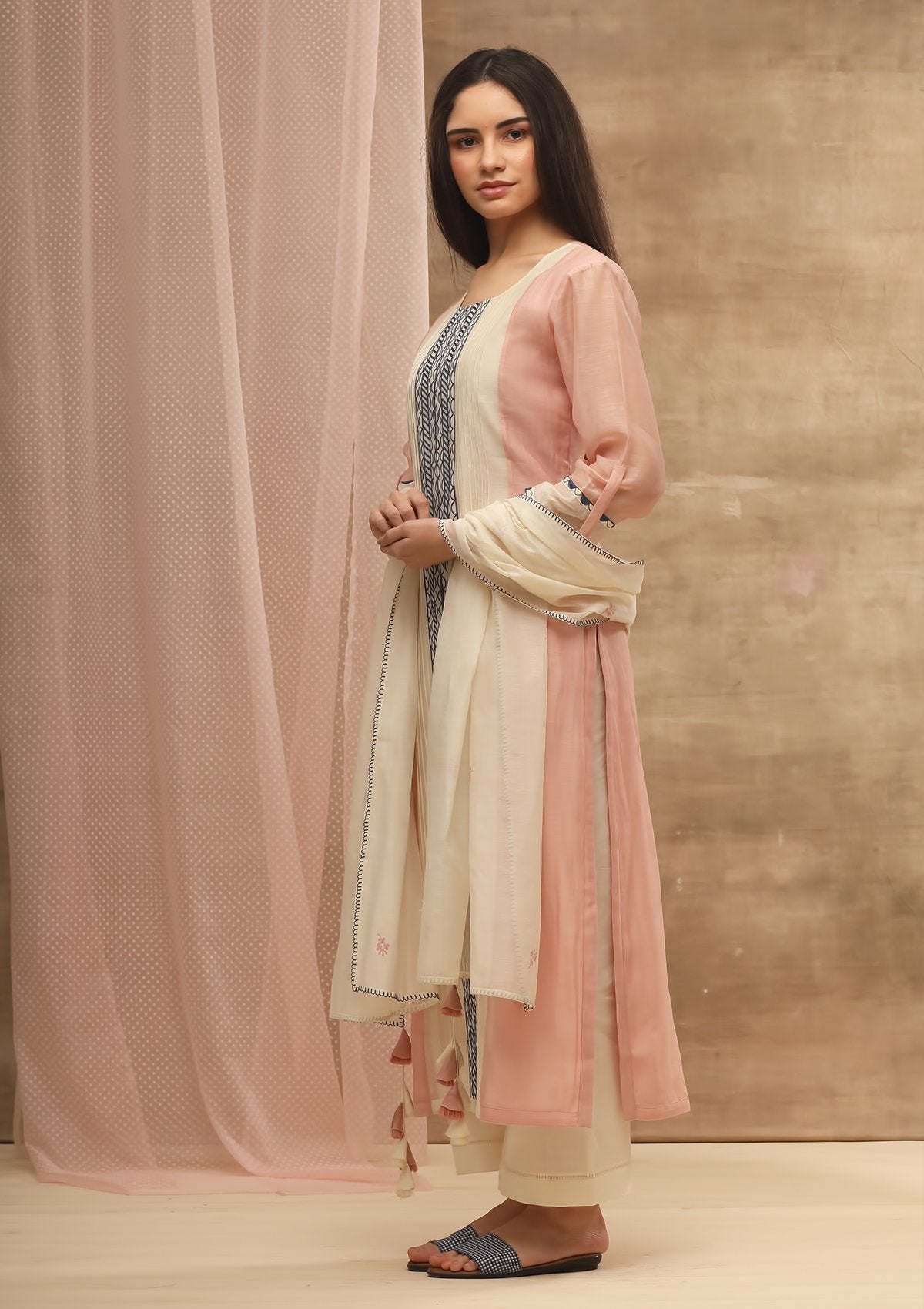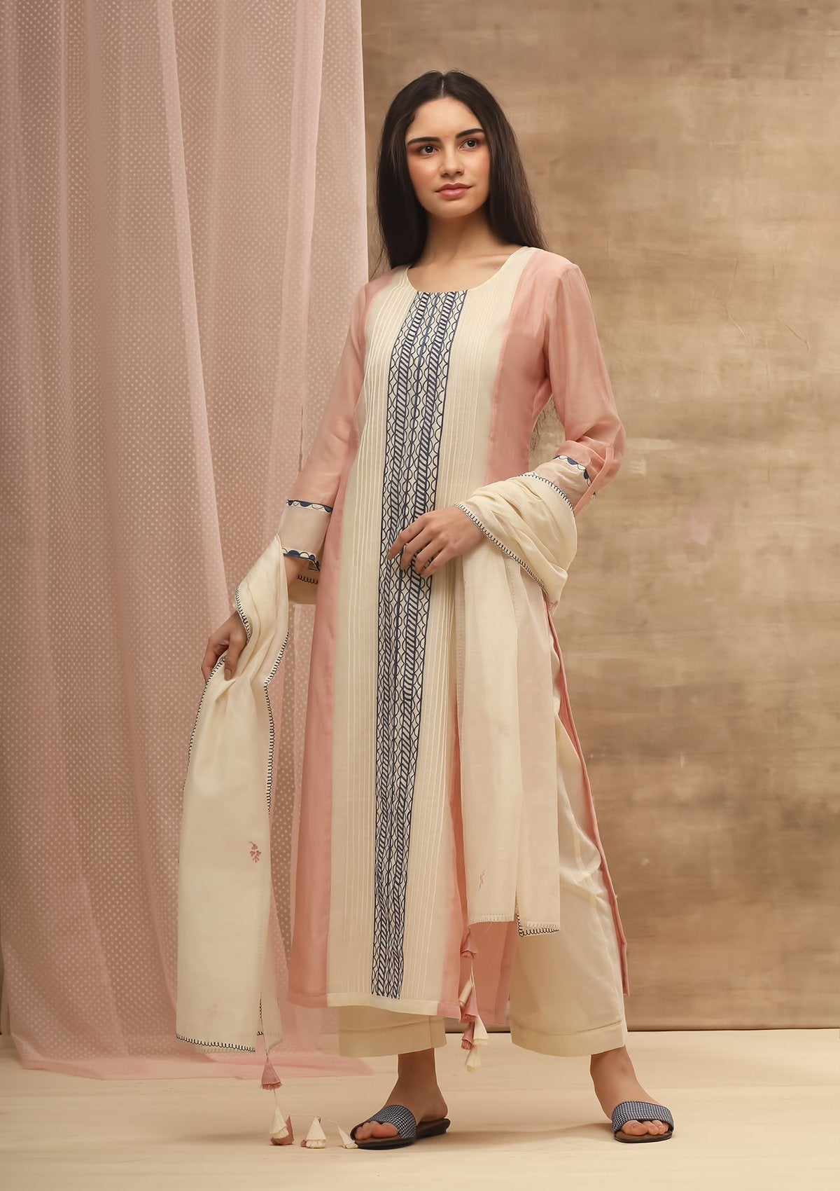 A cotton Chanderi aari embroidered kurta. It comes with a dupatta.