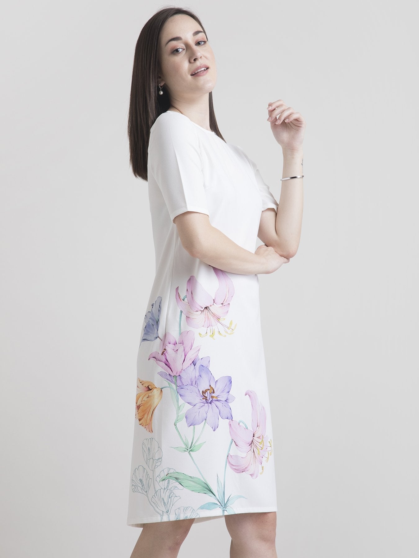 This white shift dress has a round neck, watercolour lily placement print, short sleeves, slit, button for closure and Polyester slip. Made from Polyester Moss Lycra, it's soft, stretchable and anti-wrinkle.