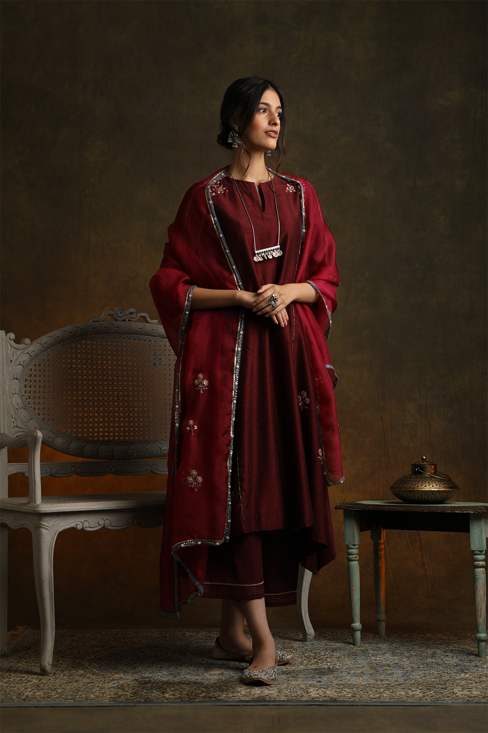 Royal & Exquisite Floral Motifs Embroidered Maroon Silk Dupion Kurta Comes Along With Matching Cotton Palazzo & Beautifully Embroidered Pink Organza Dupatta.